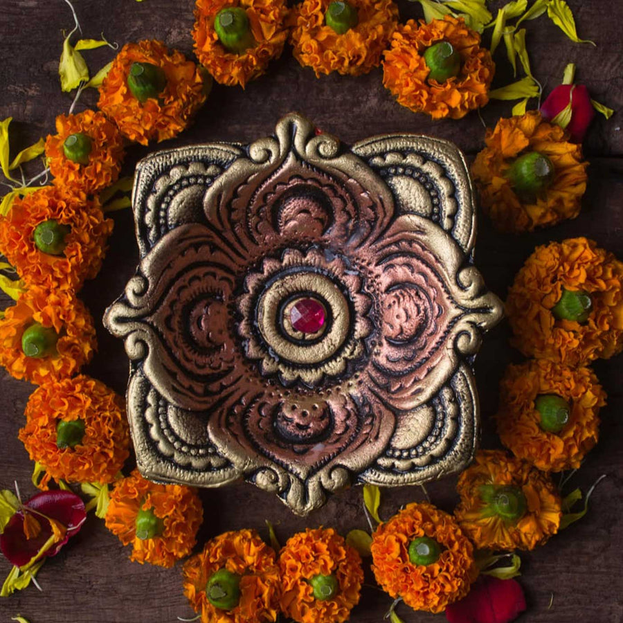 13. Pooja Decor Items:Choose elegant items for pooja ceremonies, such as intricately designed thalis or decorated incense holders. These essential pieces add sophistication to spiritual rituals and enhance the ceremonial experience.