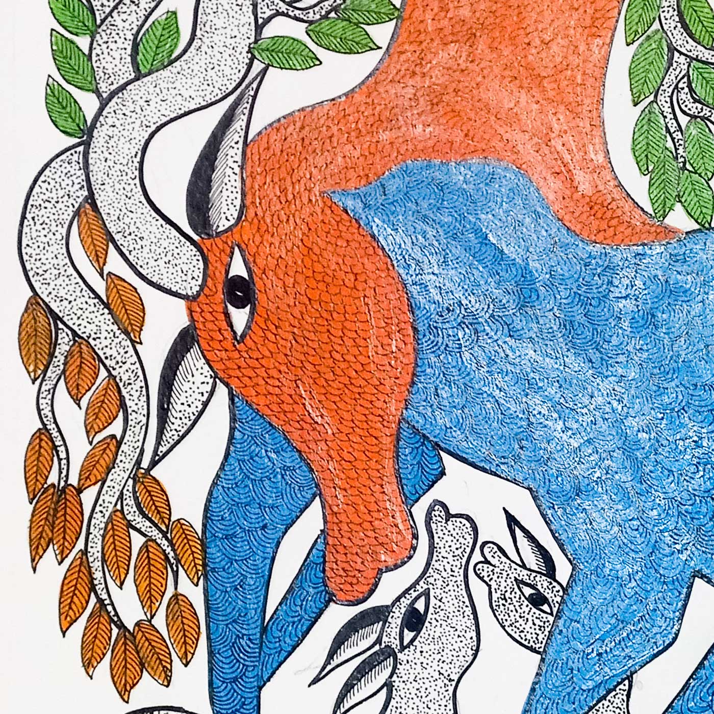 - Hand-painted on premium quality paper with acrylic colors, it showcases the Gond style’s intricate patterns, vibrant palette, and fine line detailing.