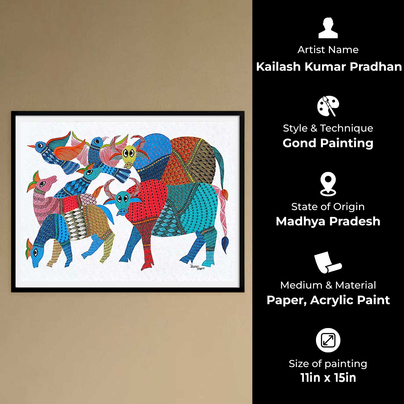 - This painting is an authentic Gond artwork created by traditional artist Kailash Kumar Pradhan, who has been practicing the art for over 15 years.
