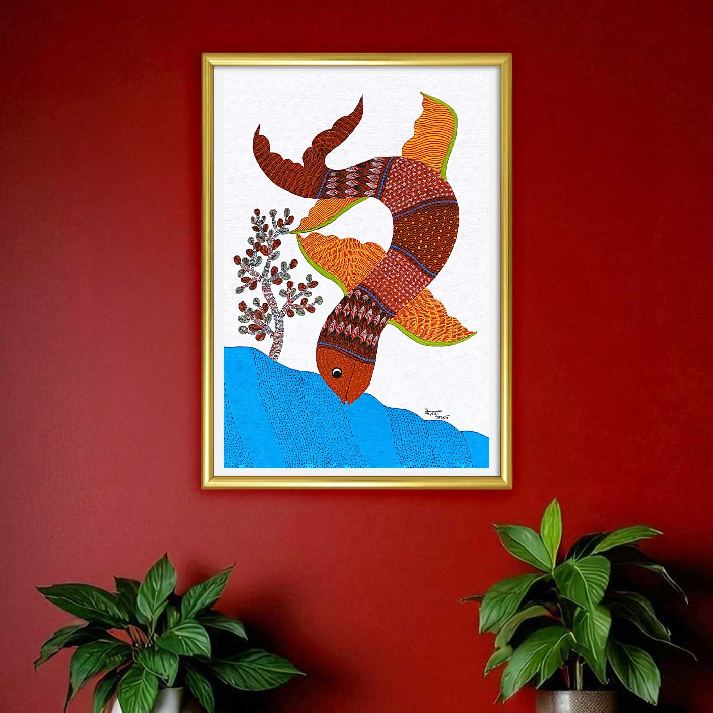 - This painting captures the essence of a fish diving into water, symbolizing harmony with nature and the deep-rooted storytelling of the Gond community.