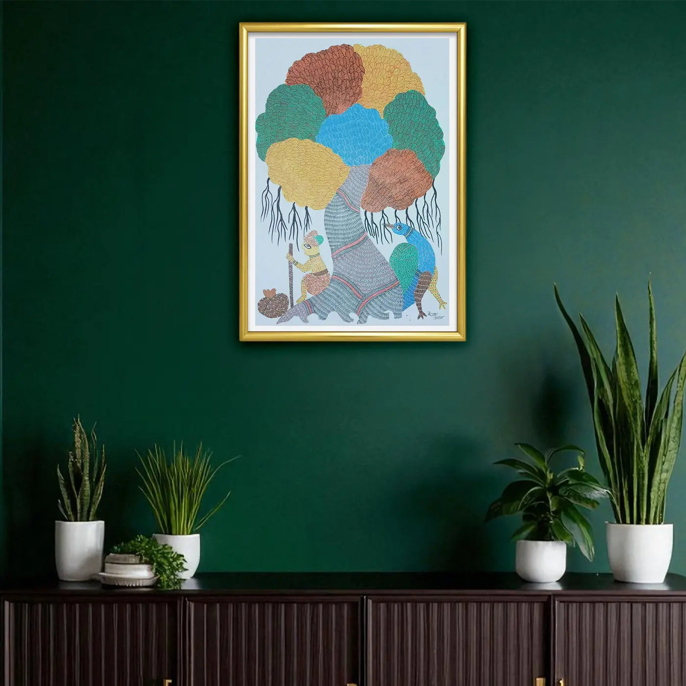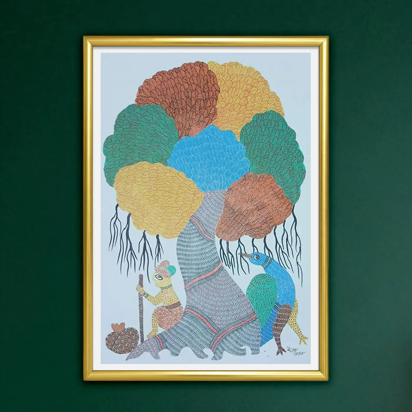 - Painted on premium paper with vibrant acrylic colours, it features intricate dot and line work characteristic of the traditional Gond style.