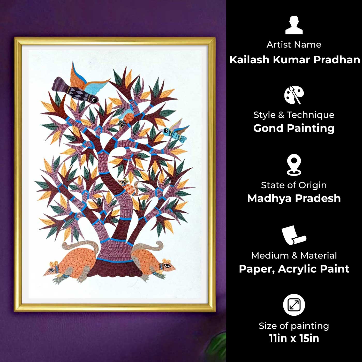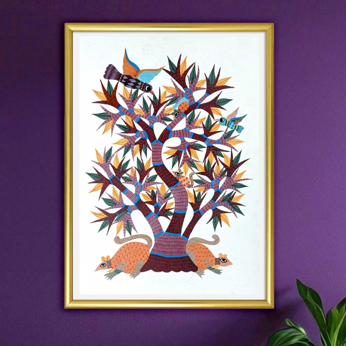 - This painting captures the Gond vision of coexistence, depicting birds and animals around a central tree in vibrant harmony.
