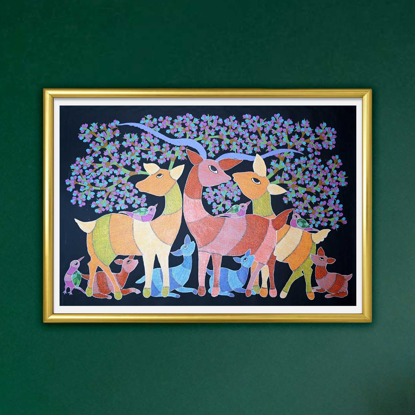 - This painting depicts graceful birds and majestic deers, set against a deep background that makes each color pop.