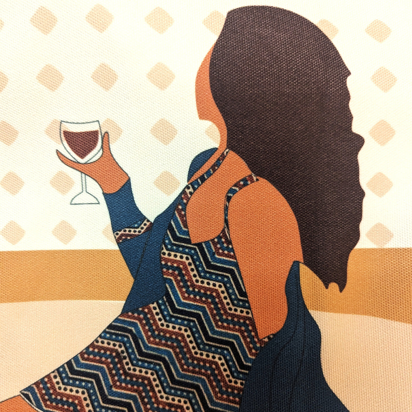 - The illustration features a woman relaxing with a book and wine, reflecting self-care and leisure.