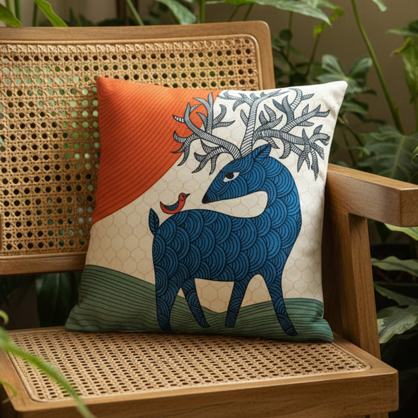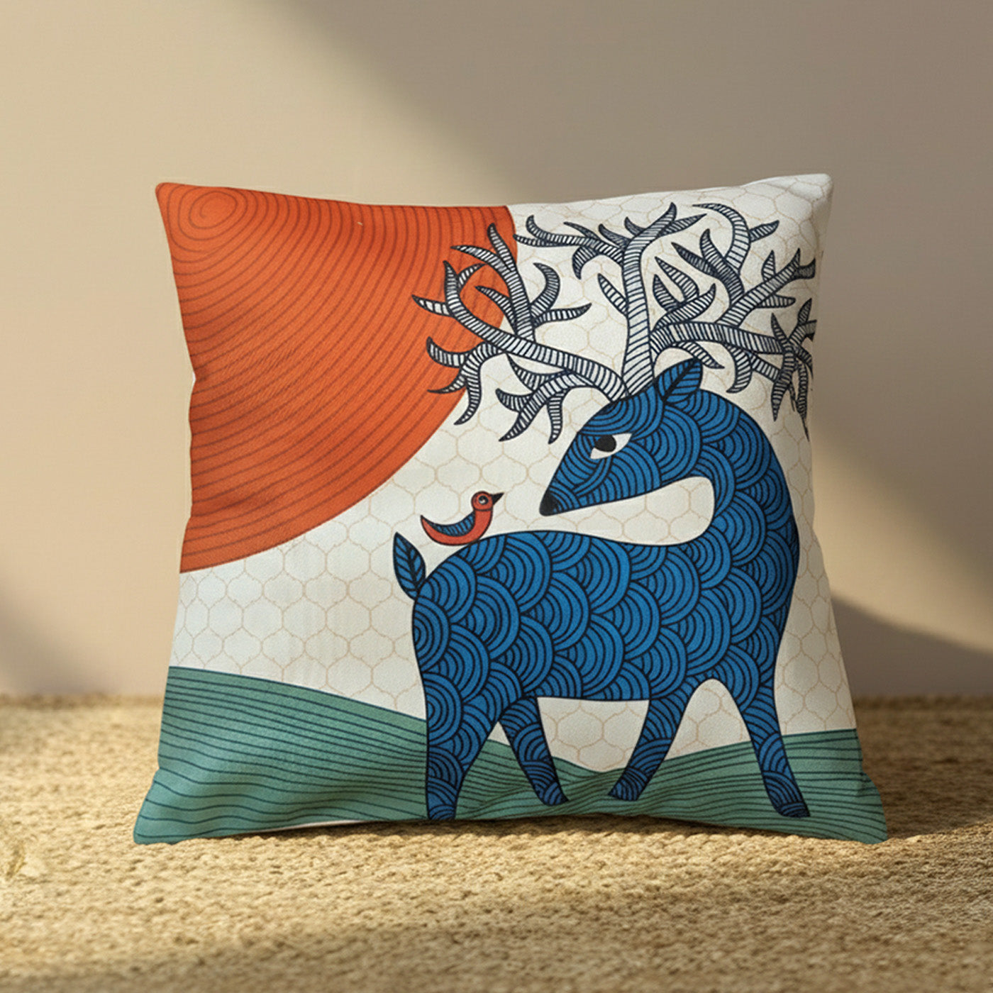 - This cushion cover showcases a graceful deer motif inspired by the legacy of Gond art from Madhya Pradesh.