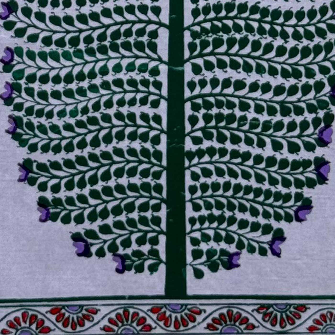 - Hand-painted on luxurious tussar silk, it uses natural pigments derived from conch powder, flowers, minerals and lamp soot.