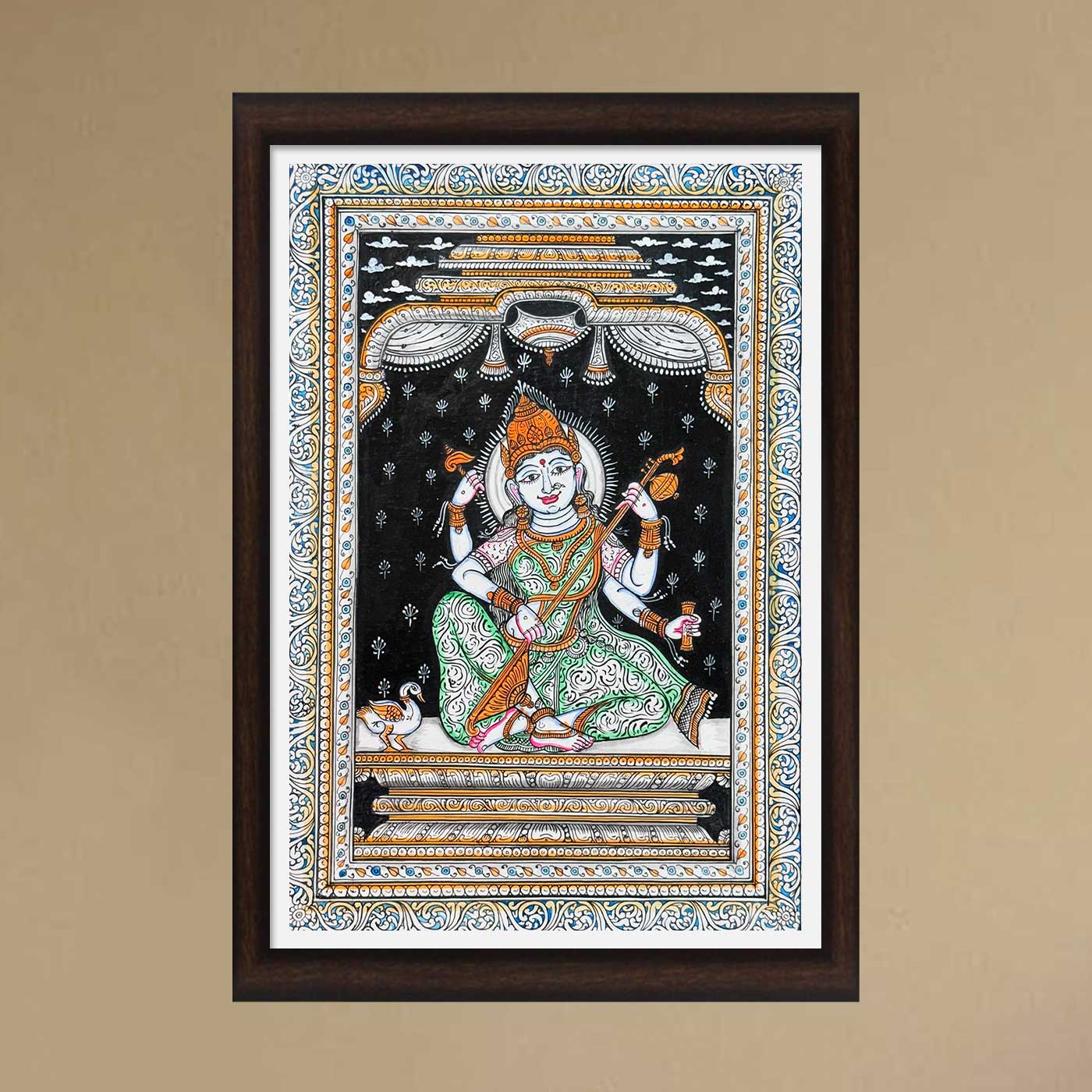- This canvas painting captures Goddess Saraswathi in a serene and graceful pose.