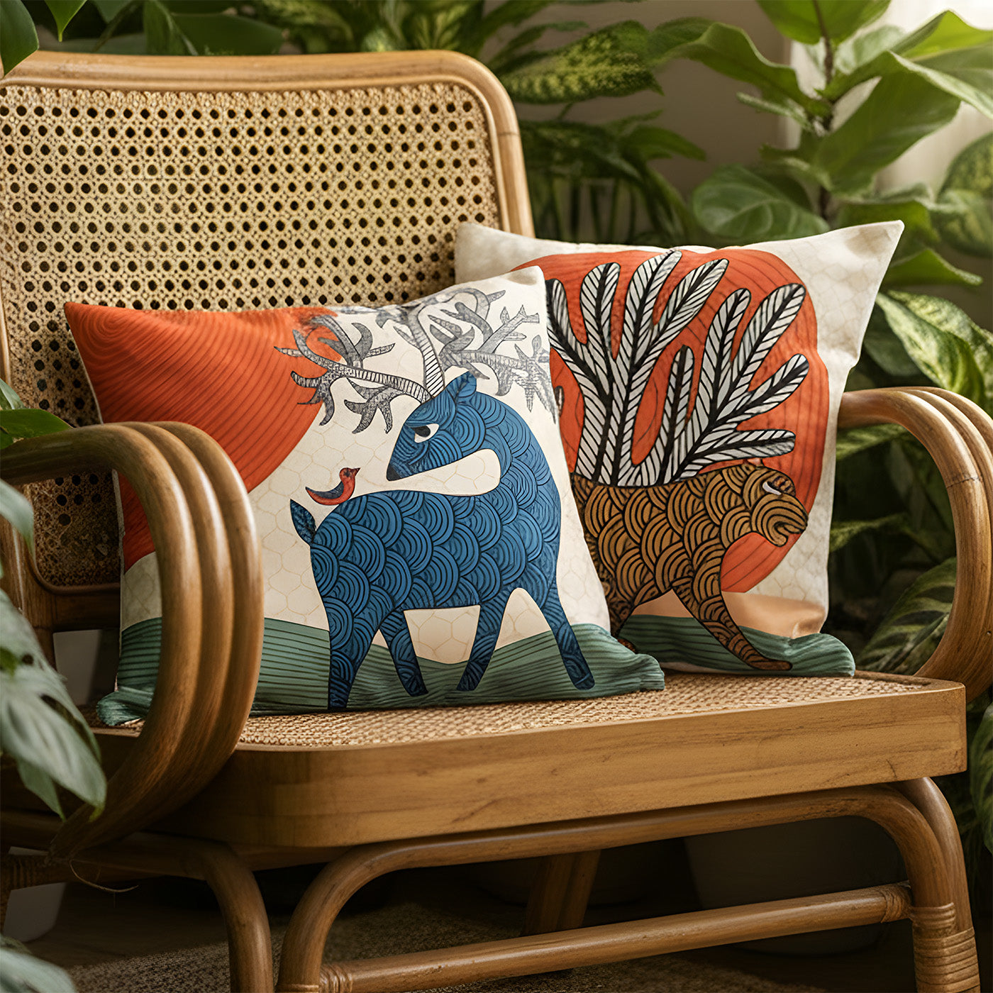 - This cushion cover duo is inspired by Gond art traditions of Madhya Pradesh, rooted in tribal storytelling.
