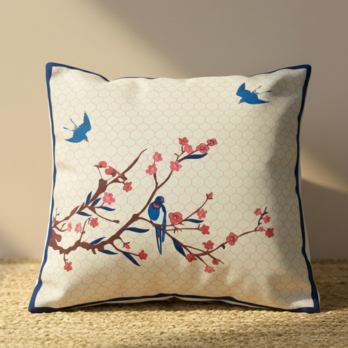 - This cushion cover set captures the essence of spring in India through blooming branches and resting songbirds.