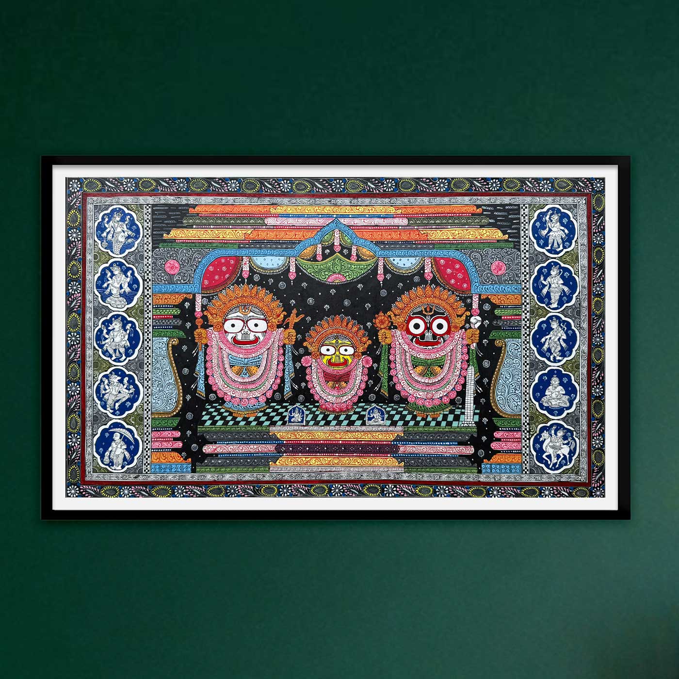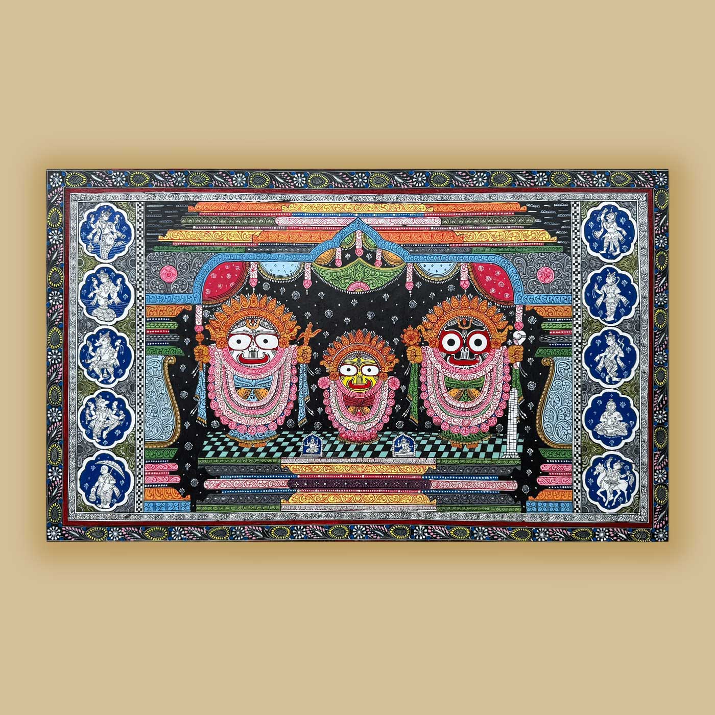 - This Pattachitra painting beautifully presents Lord Jagannath, Balabhadra, and Subhadra in their iconic divine form.