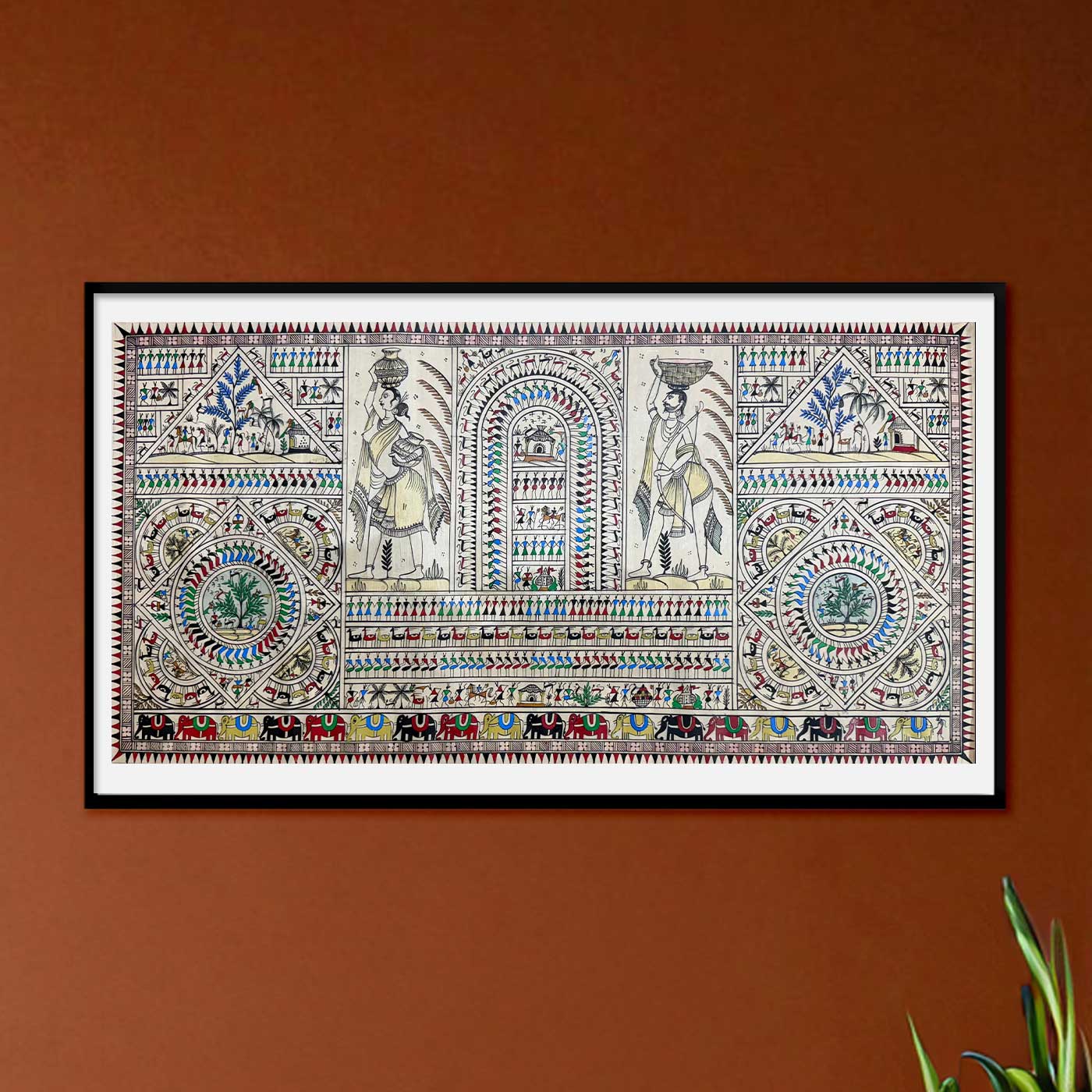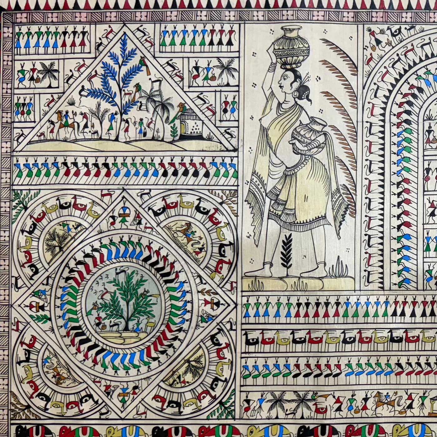 • This hand-painted silk artwork brings to life the vibrant Saura tribal art of Odisha.