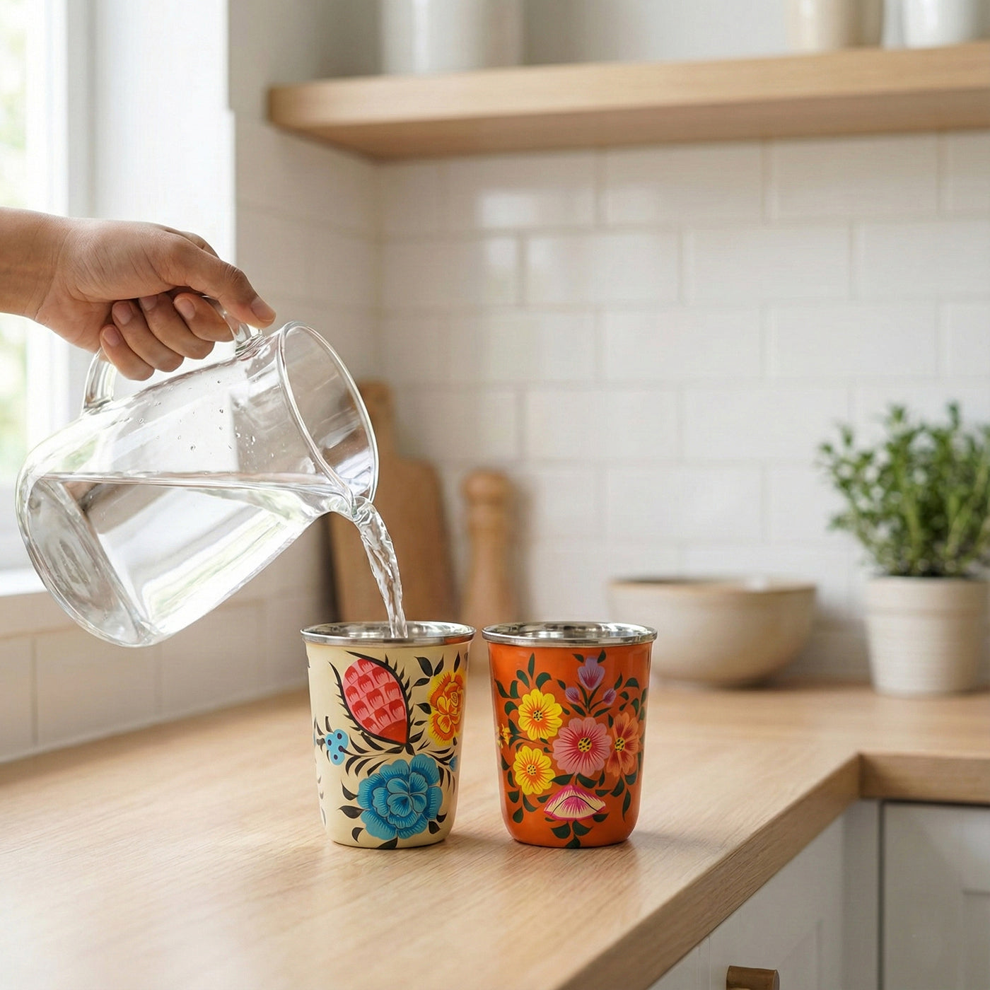 - A set of 2 elegant glasses that combine functionality with festive Kashmiri charm.