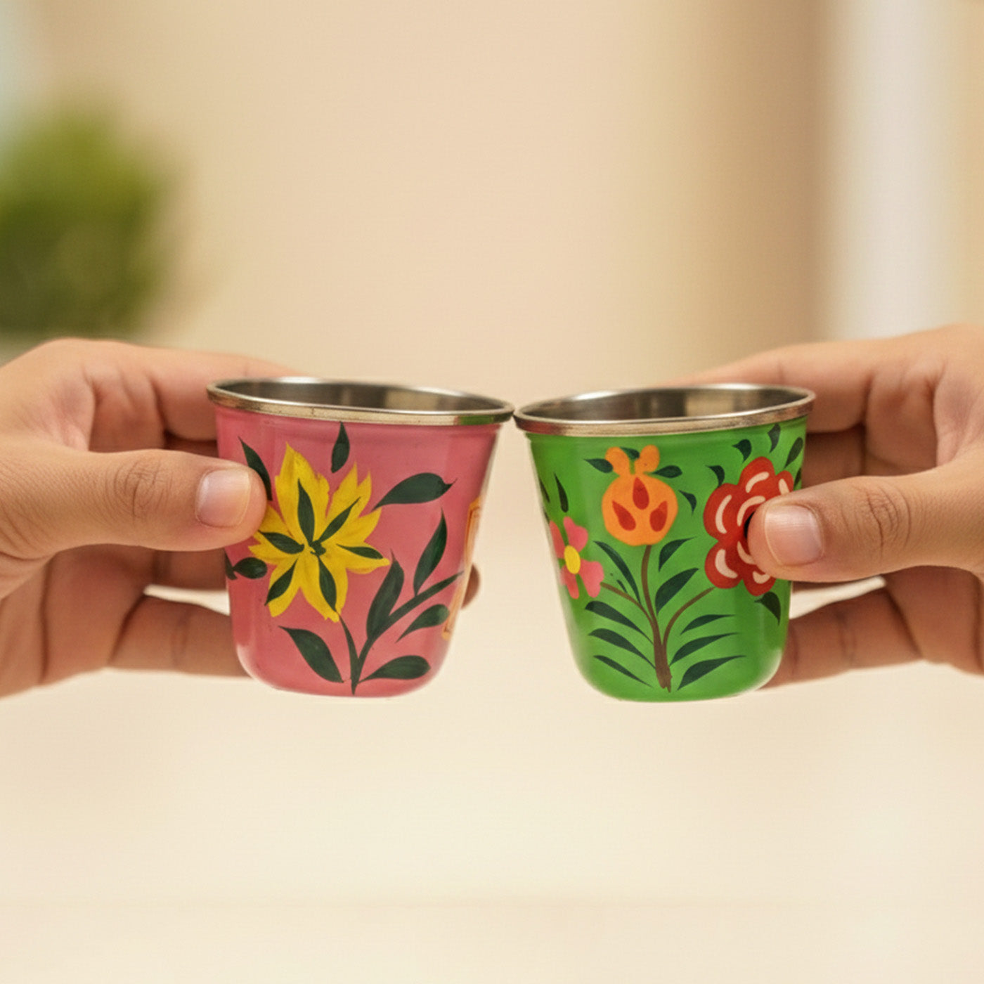 2Pc | Hand-Painted Green & Pink Floral Kashmiri Art Stainless Steel Shot Glasses