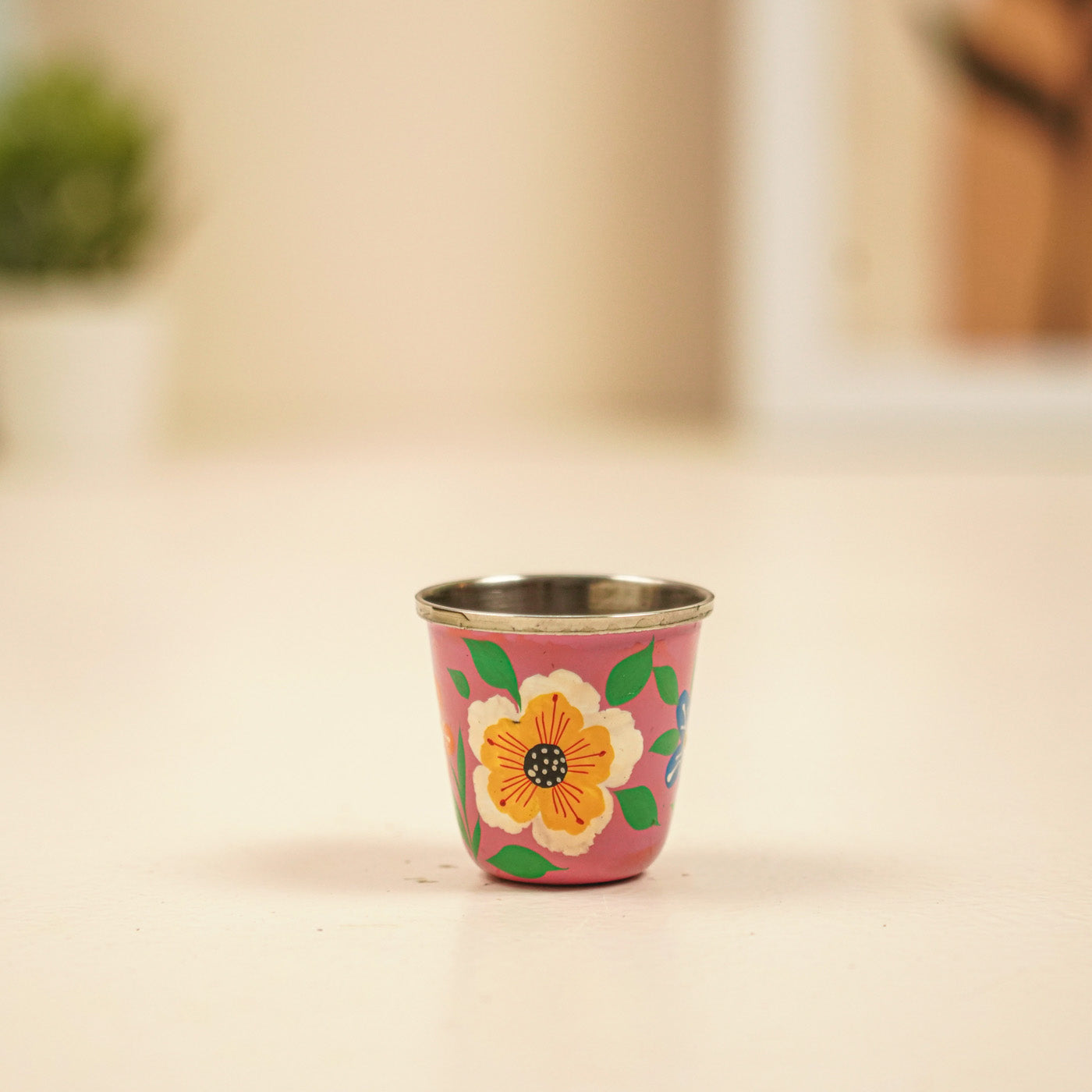 2Pc | Hand-Painted Pink & Purple Floral Kashmiri Art Stainless Steel Shot Glasses
