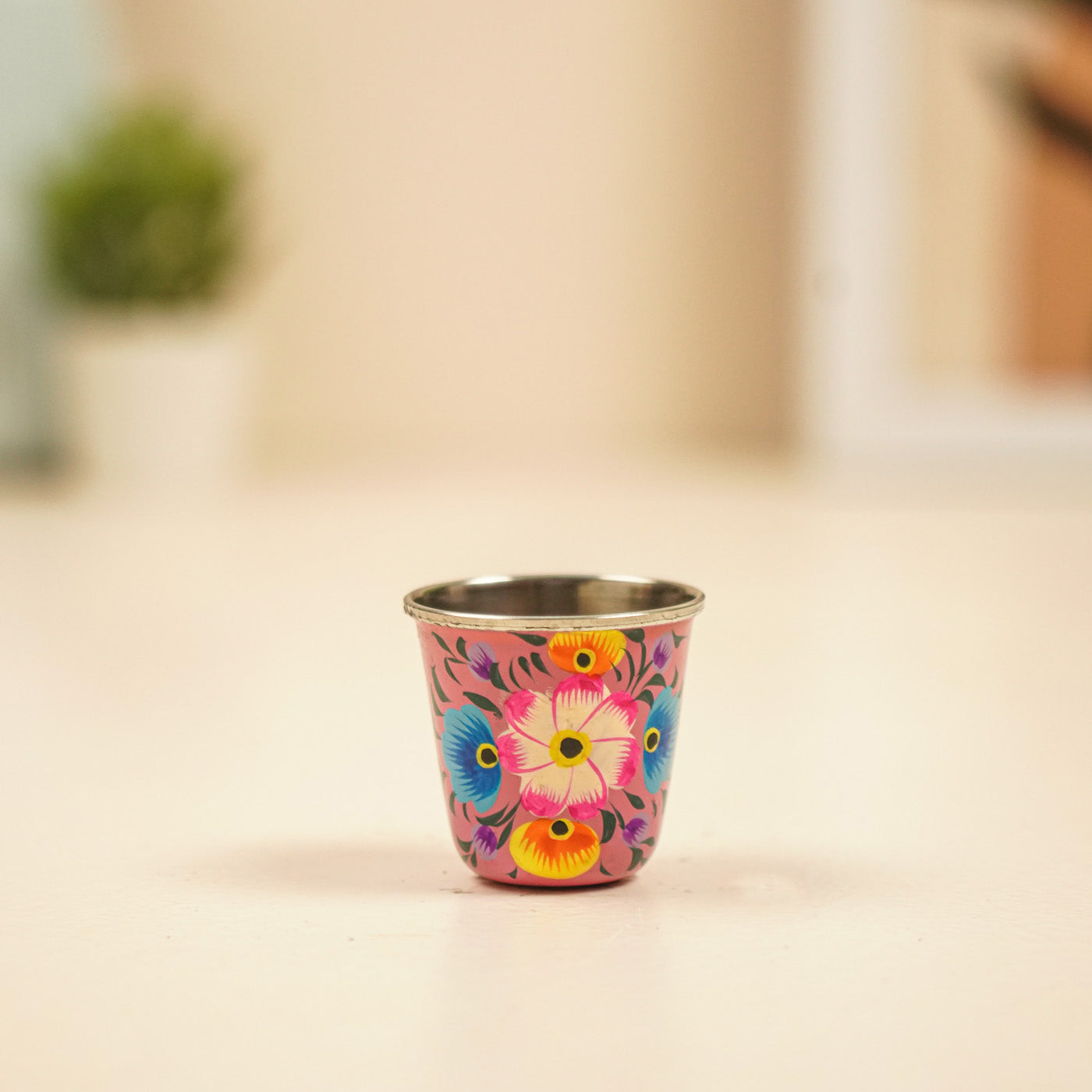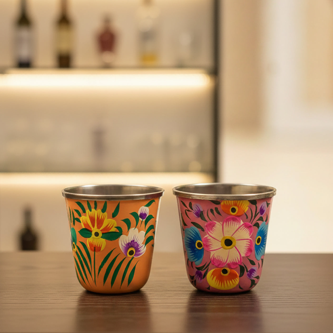 2Pc | Hand-Painted Yellow & Pink Floral Kashmiri Art Stainless Steel Shot Glasses