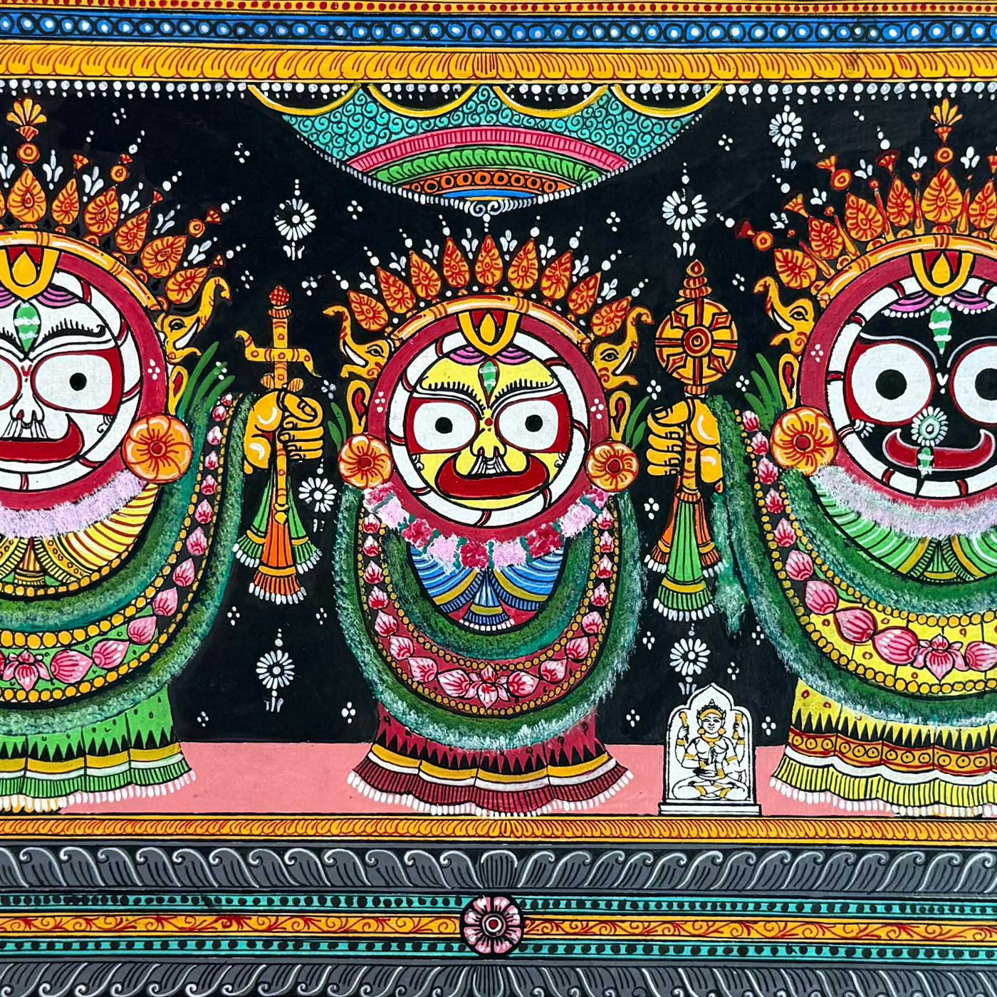 - The artwork highlights symbolic motifs and patterns central to Jagannath worship and mythology.