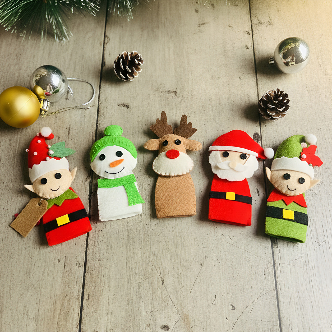 - Handmade from soft, child-friendly felt, each puppet features a charming Christmas character.