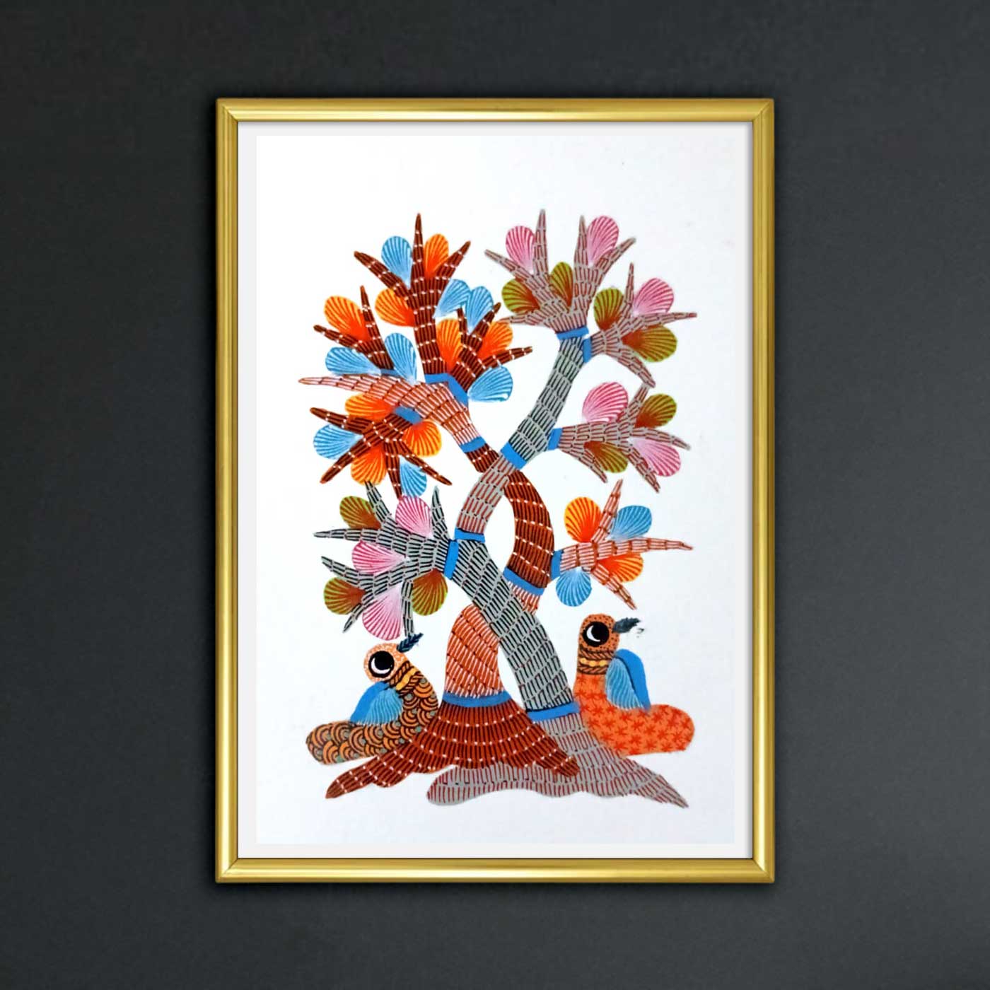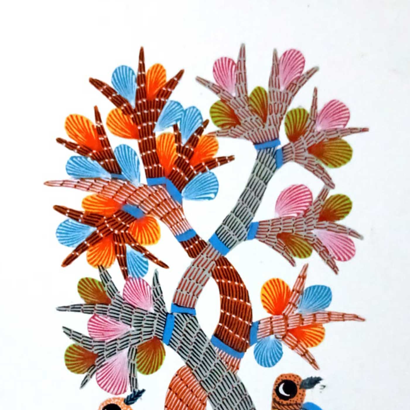 - It is hand-painted on paper using acrylic colors, with fine dots, dashes, and patterns that define the traditional Gond style.