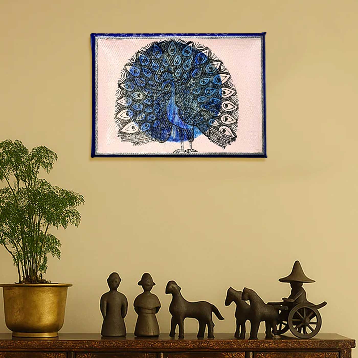 - The painting is executed on mounted canvas using intricate detailing, fine lines, and a vibrant color palette, sealed with varnish for durability and a soft sheen.