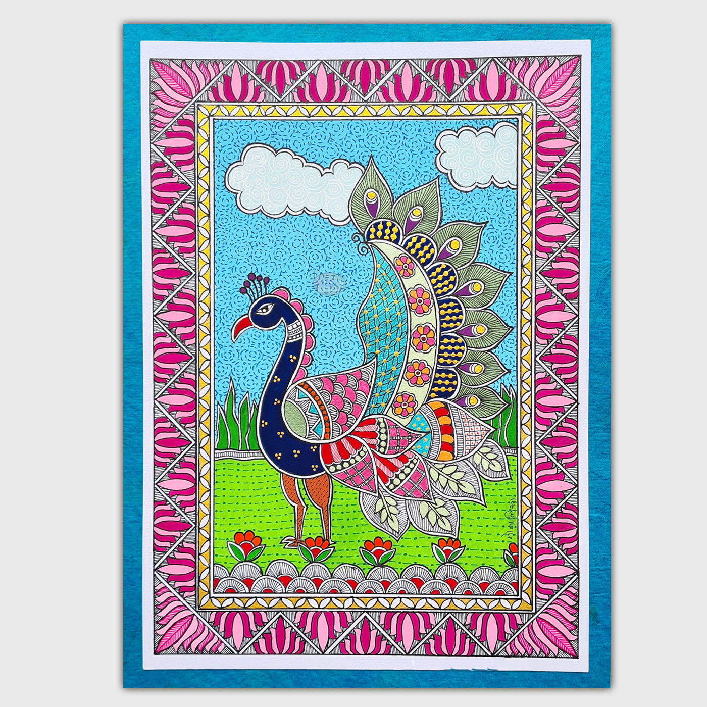 - Painted on premium 300 GSM hot-pressed watercolor paper, the detailing reflects the intricacy and bold linework of Mithila tradition.