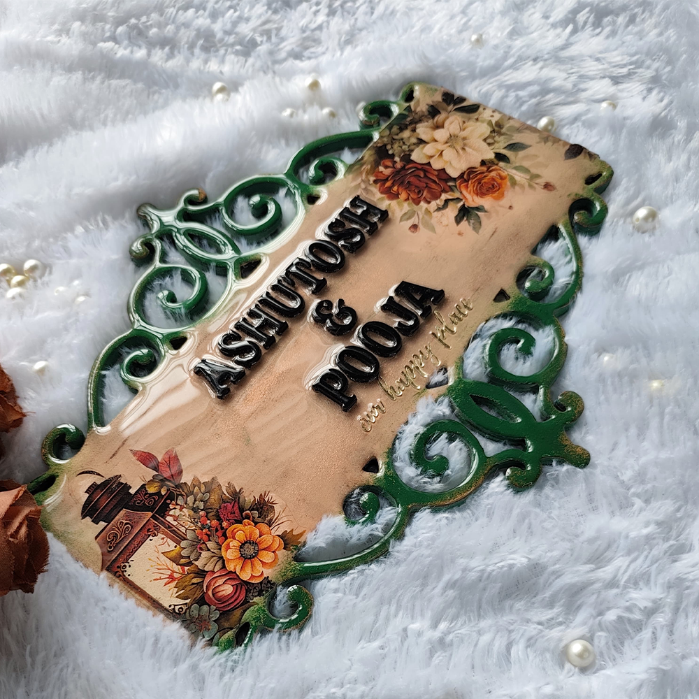 - Enhance your entryway with this handcrafted resin name plate inspired by classic vintage swirl florals and timeless design aesthetics.