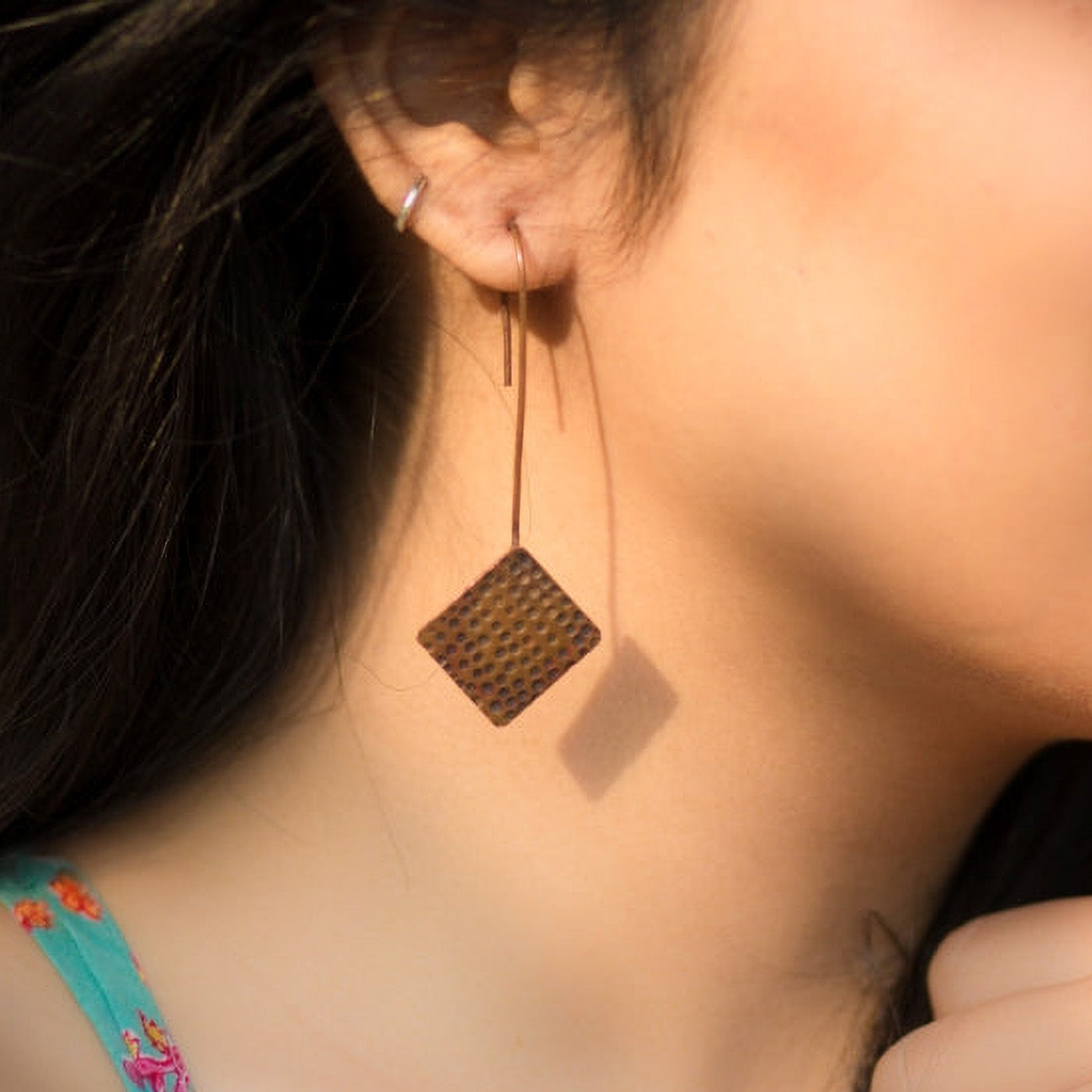 - These earrings showcase a striking rhombus shape with a unique beaten texture.