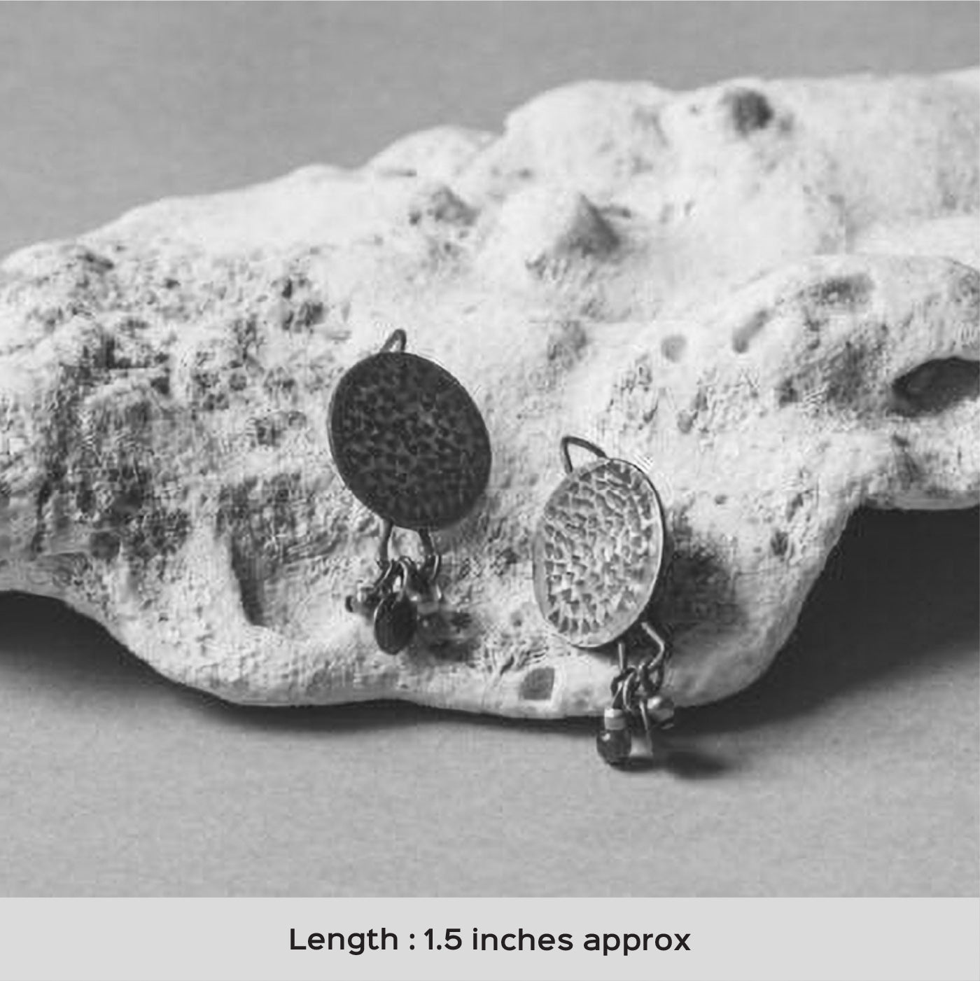 - These earrings feature a handcrafted circular copper disc paired with delicate dangling elements.