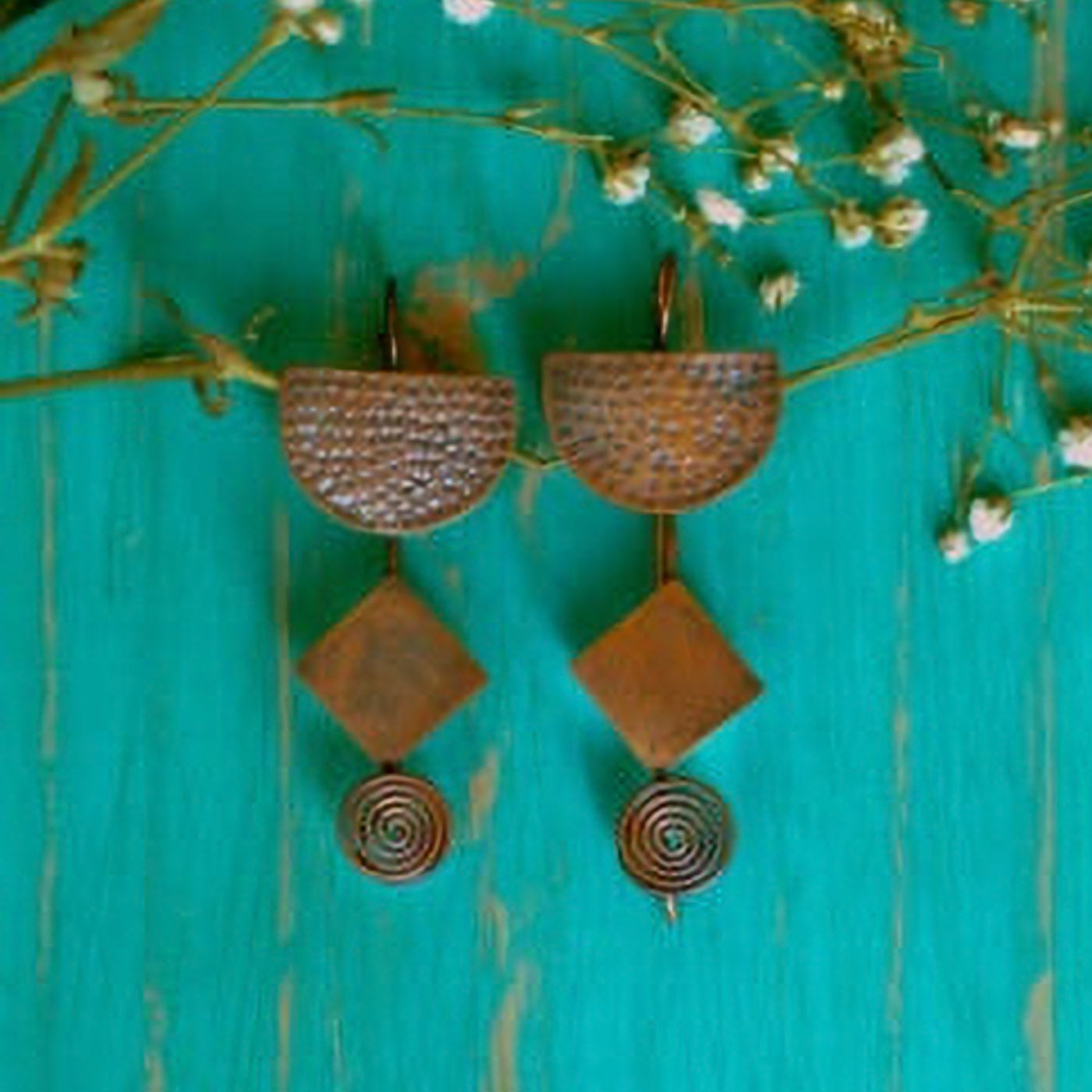 • These semicircular copper earrings celebrate the beauty of hand-textured metalwork.