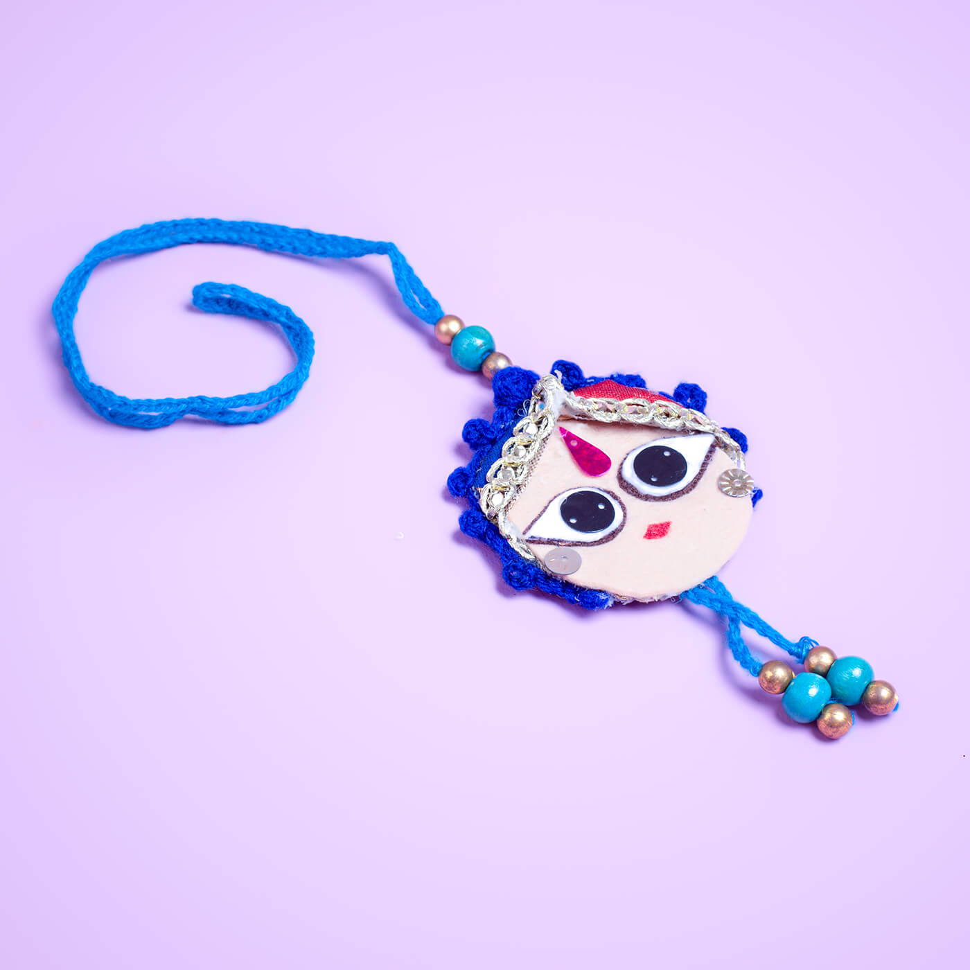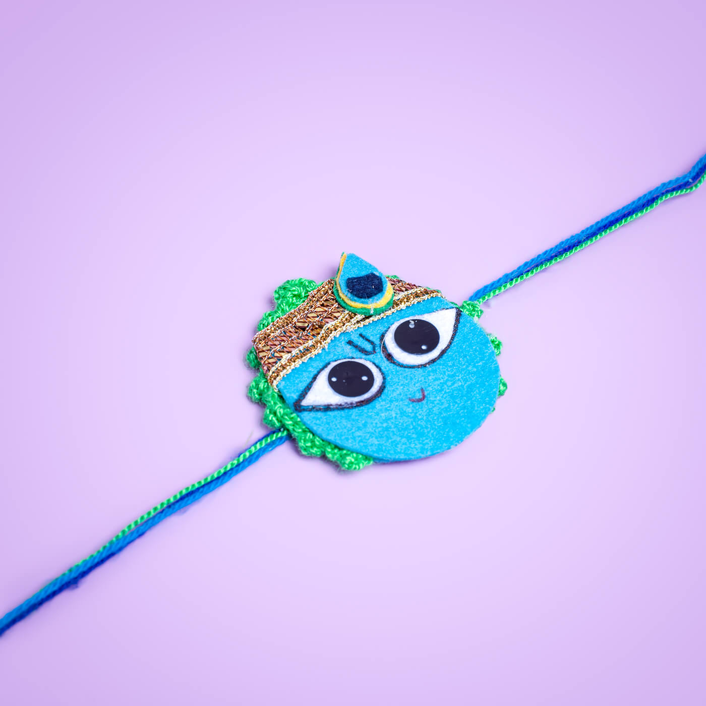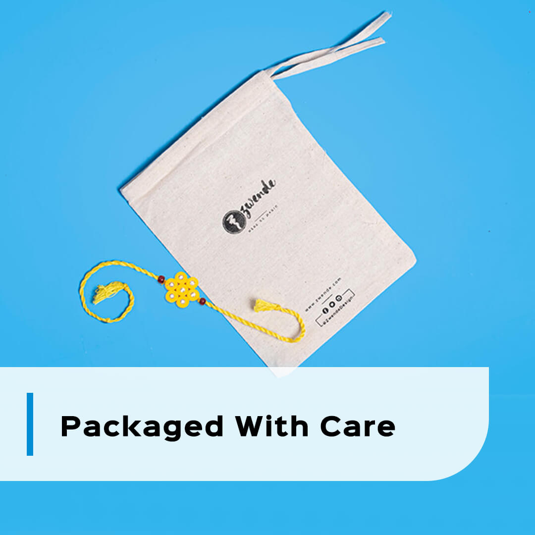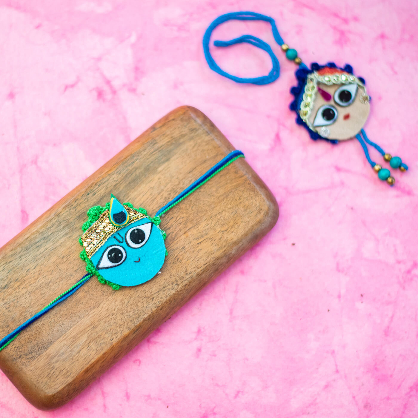 - Fulfil all your Rakhi needs with this hamper that includes two intricate felt Rakhis, a silk potli bag with mishri and a small bottle along with kumkum and chawal.