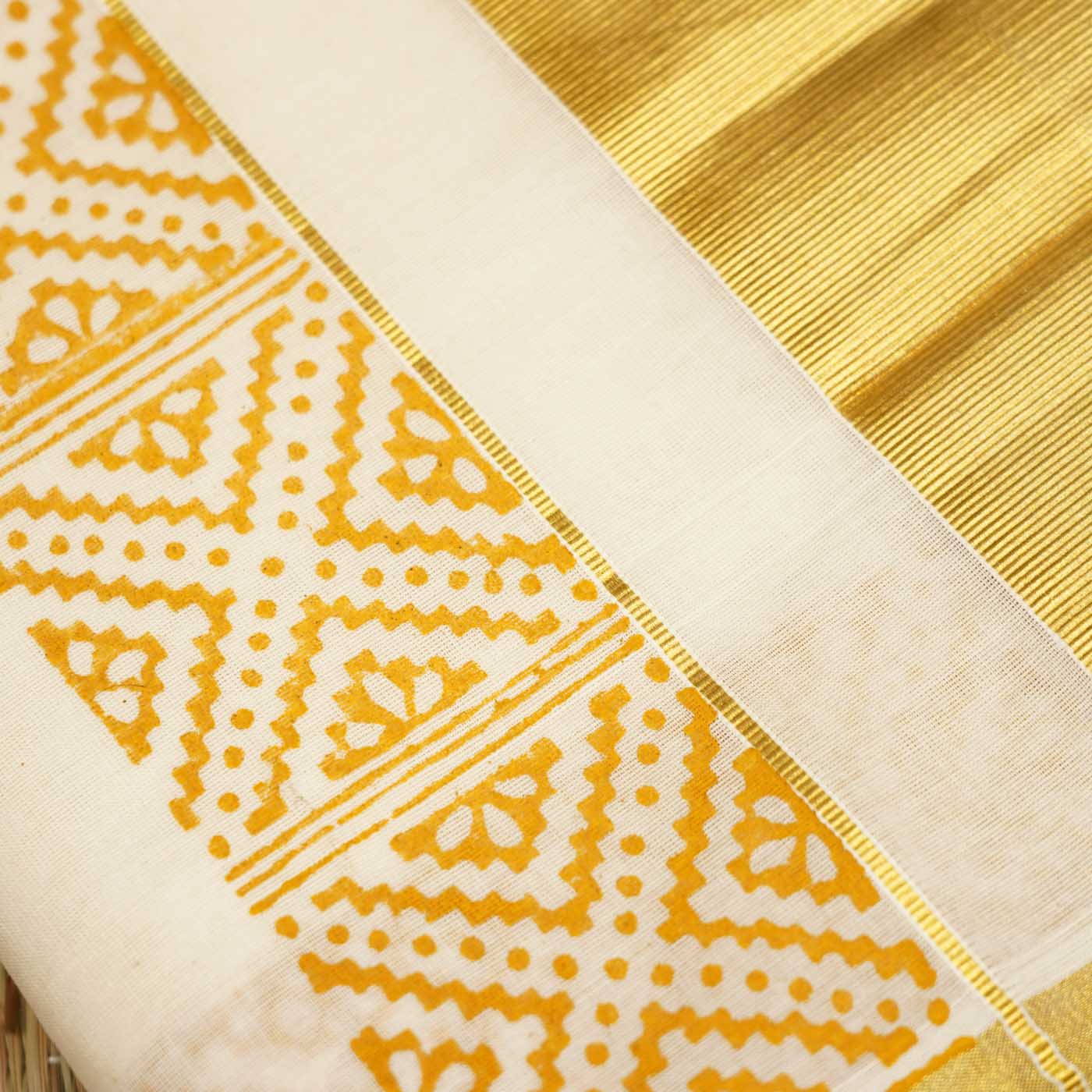 Mandala Motif Saree | Hand Block Printed Pure Cotton Kerala Kasavu Sar