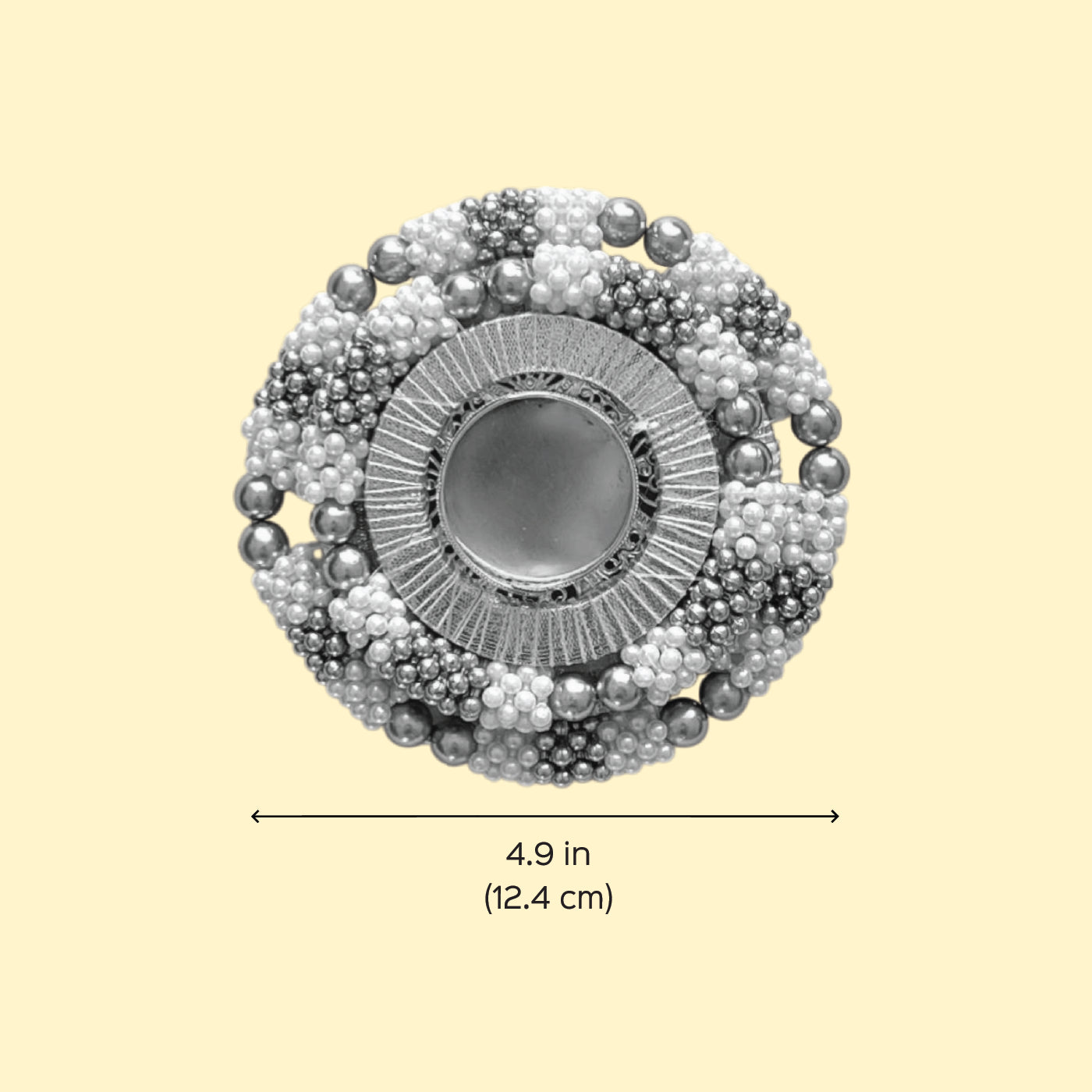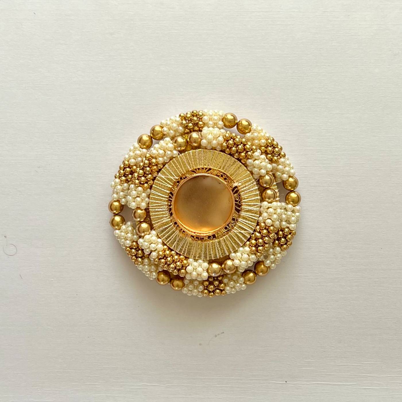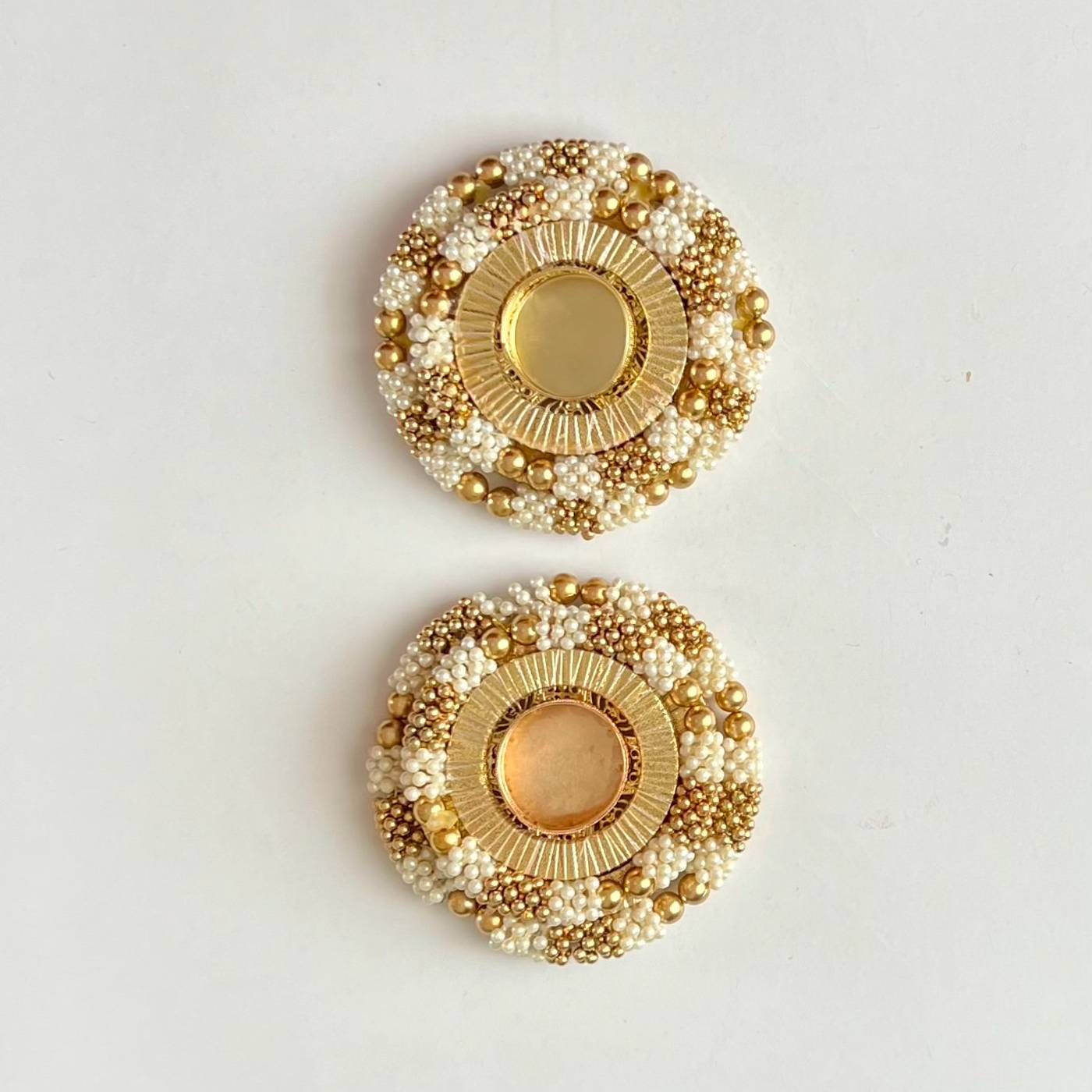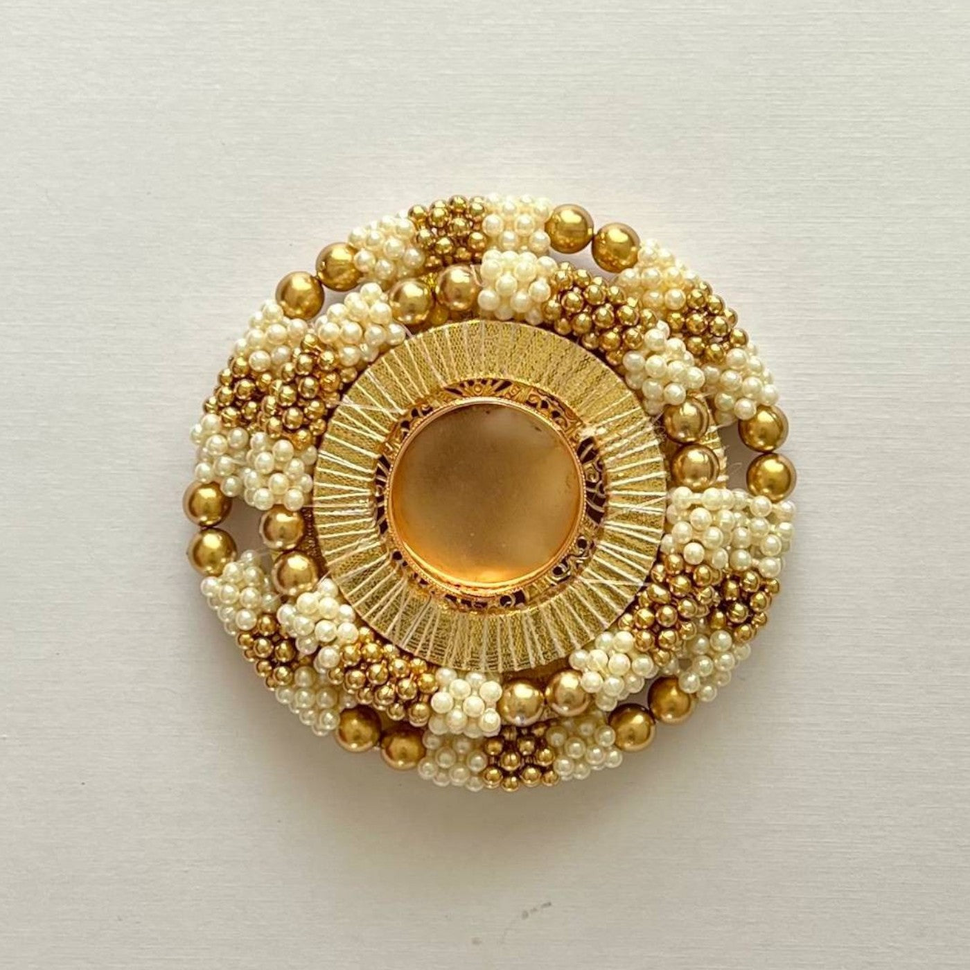 - Crafted with pearls, sequins, and vibrant gota work, the floral motif frames a sturdy metal tealight cup—bringing traditional charm to your décor.