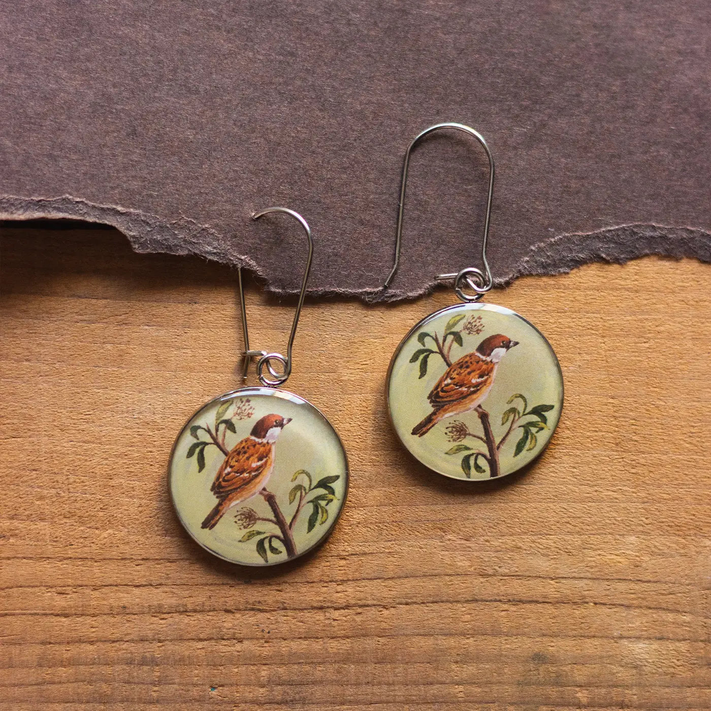 - Each pair features original, hand-drawn sparrow illustrations sealed in a layer of glossy resin.