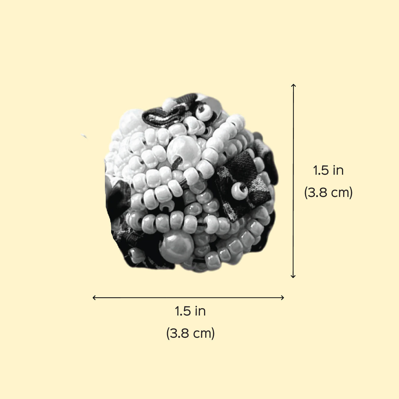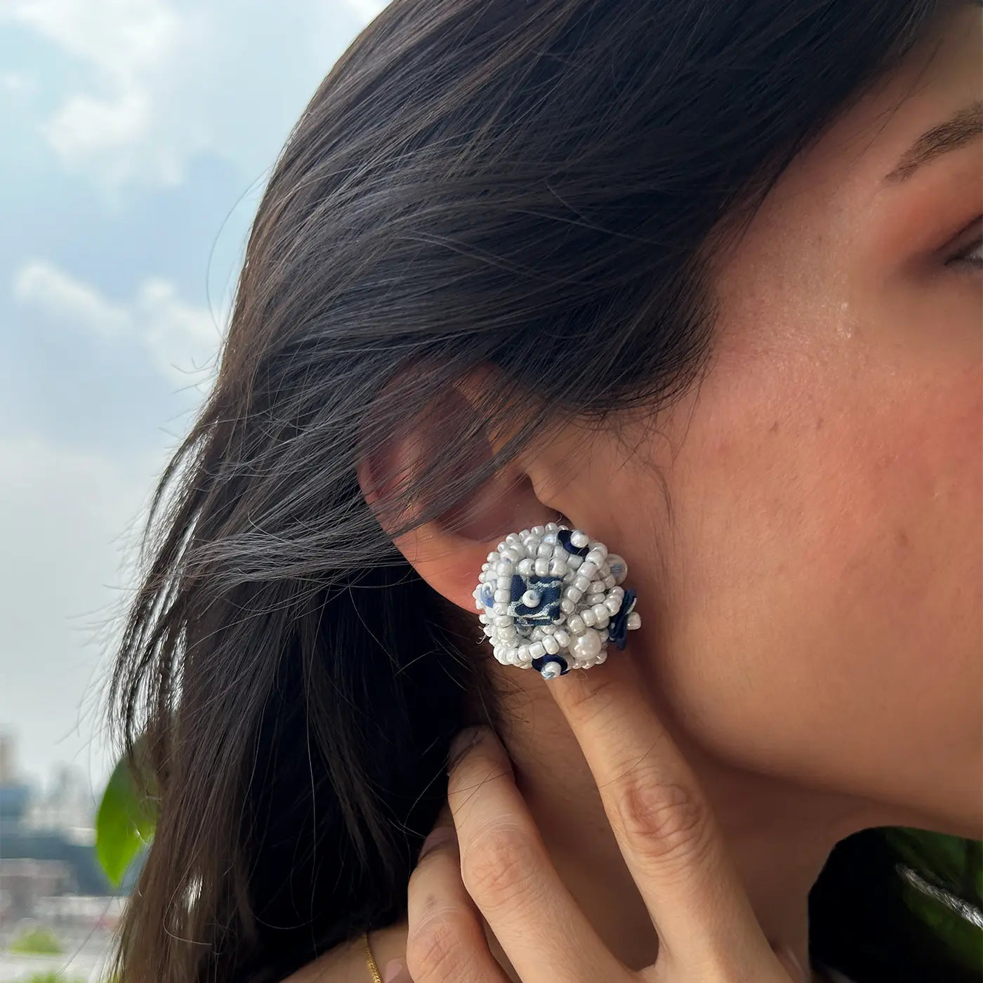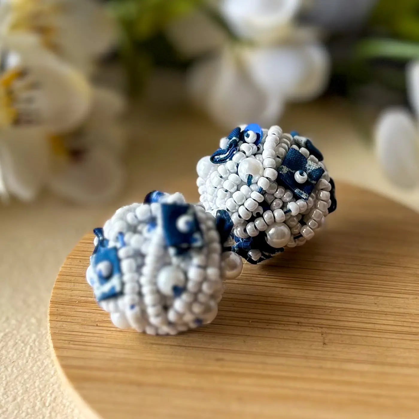 - Crafted on a cotton base, each earring features painstakingly stitched indigo beadwork, fine sequins, and white pearls arranged with ceramic-like precision.