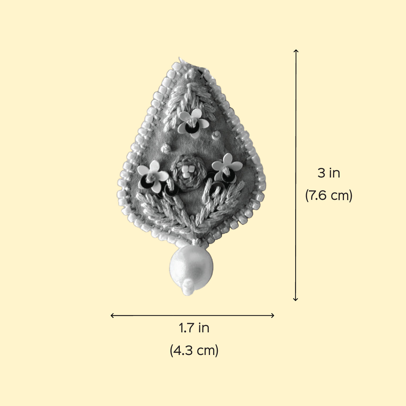 - Set on dusty blue cotton, each drop-shaped piece features tiny thread florals, beads, and a lustrous pearl accent.
