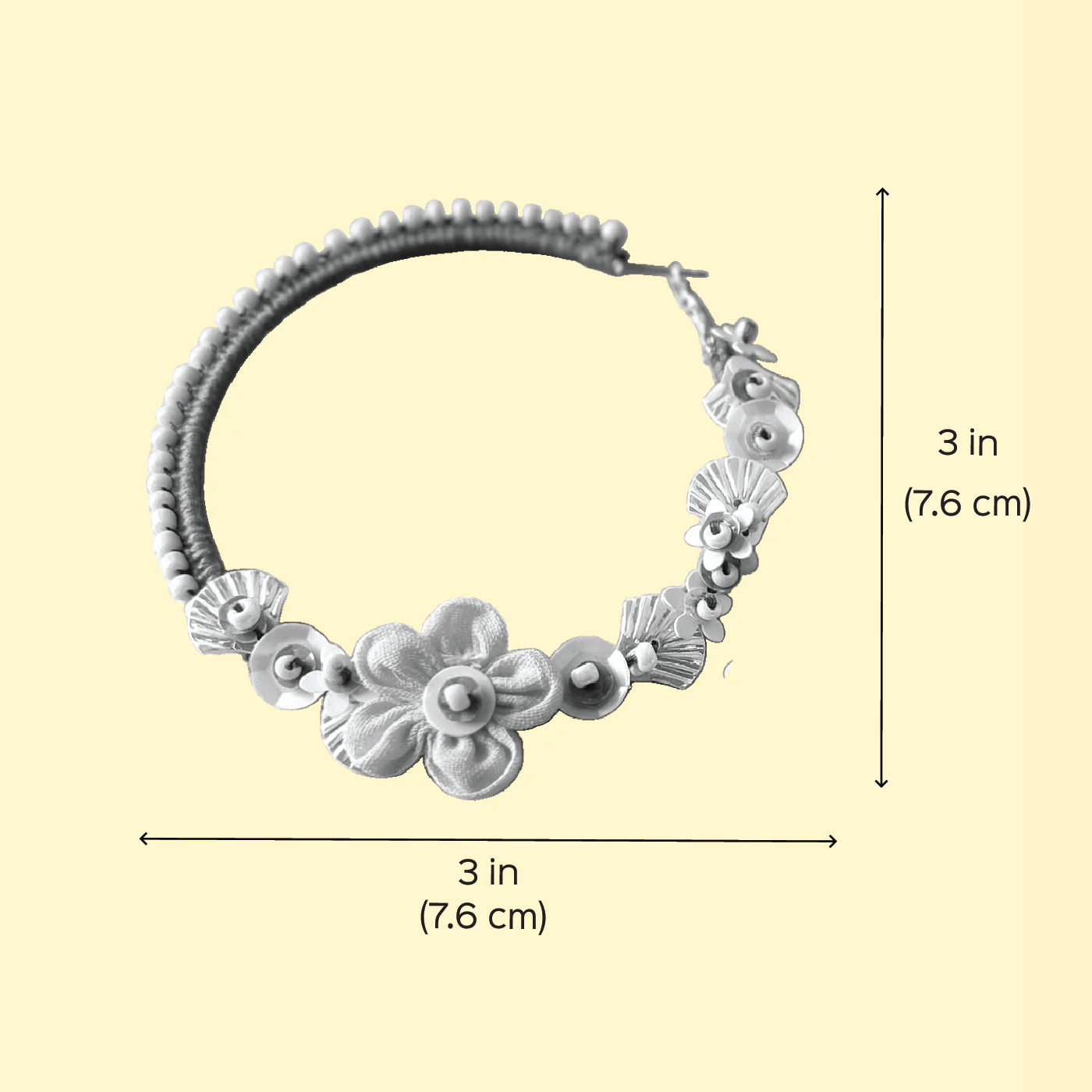 - Handcrafted in deep blue thread, these oversized hoops burst with yellow beads, florals, and mirror sequins.