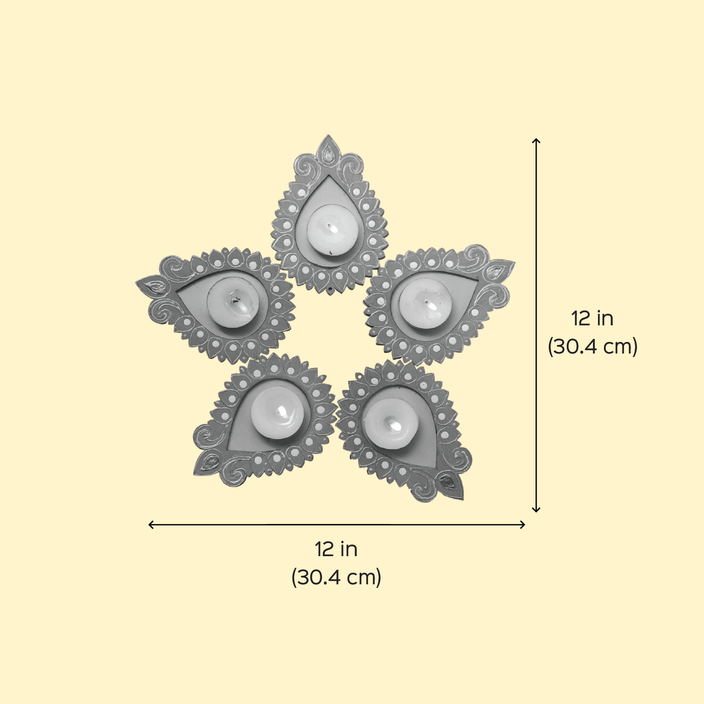 • The set doubles as a miniature rangoli, allowing you to create a decorative arrangement with five tealight holders and included tealights.