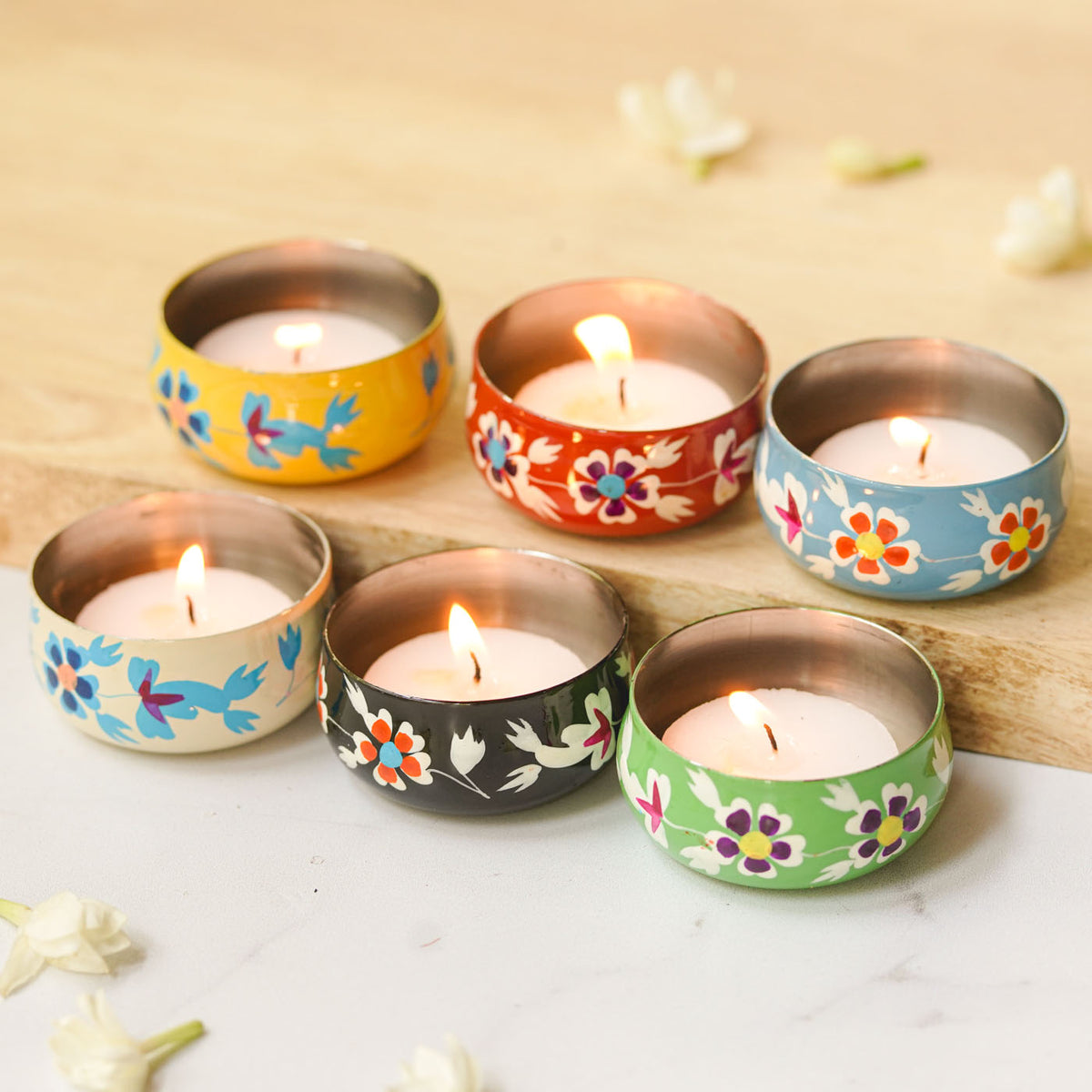 - These tealight holders are adorned with traditional Kashmiri Naqashi, a centuries-old hand-painting artform.