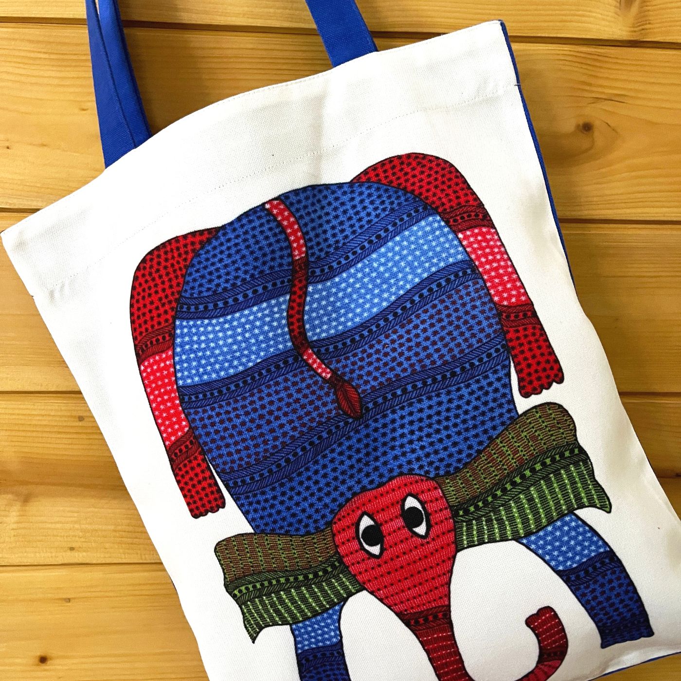 - Celebrate indigenous artistry with this canvas tote featuring a hand-painted Gond elephant design.
