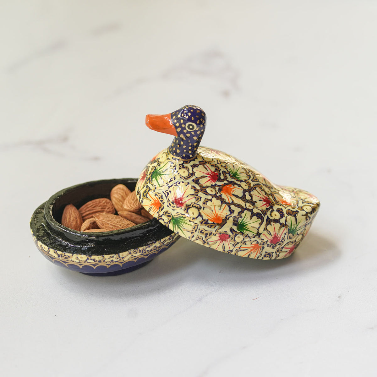 - A charming duck-shaped trinket box crafted using Kashmiri paper mache.
