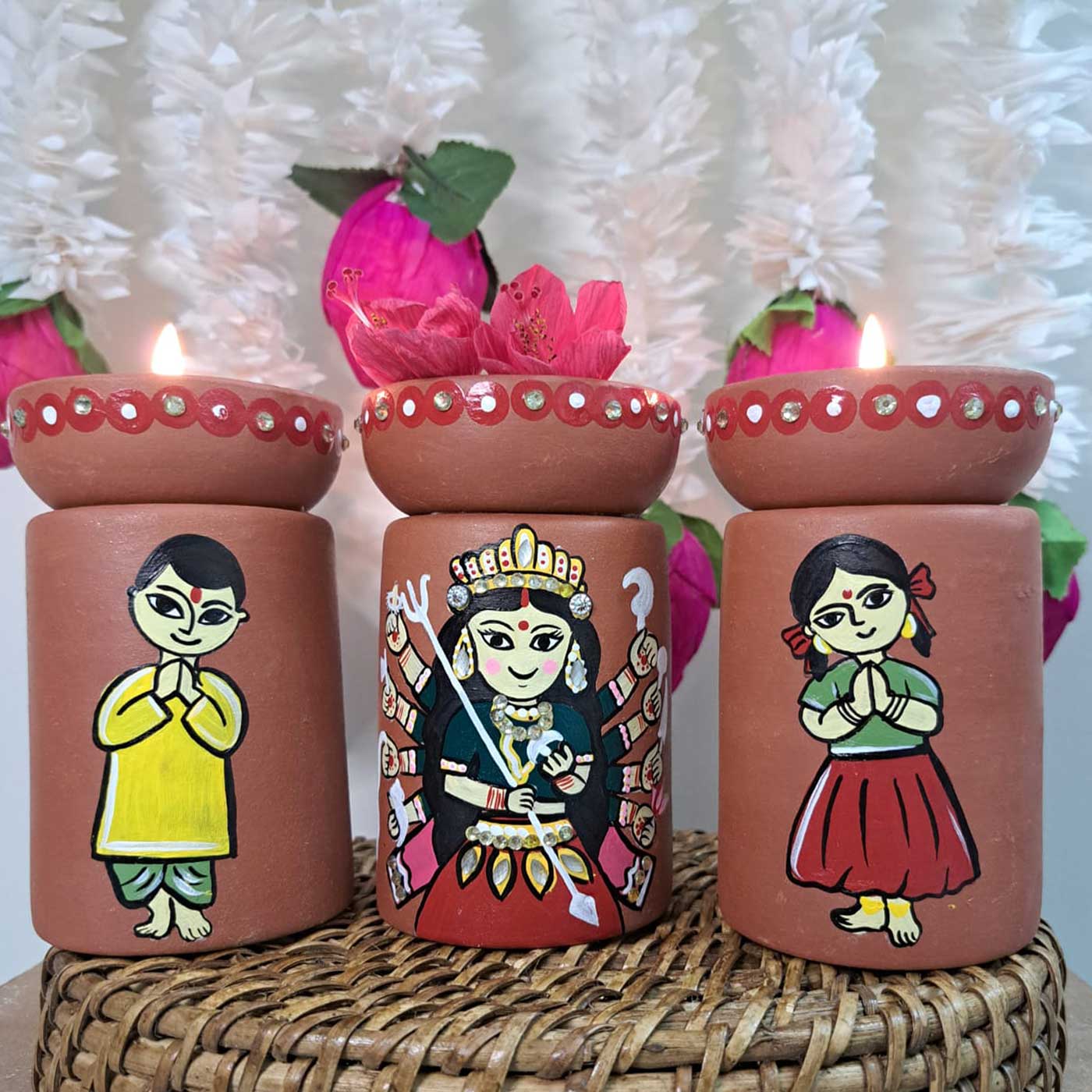 - Illuminate your home with this hand-painted Maa Durga-themed terracotta tealight holder set.