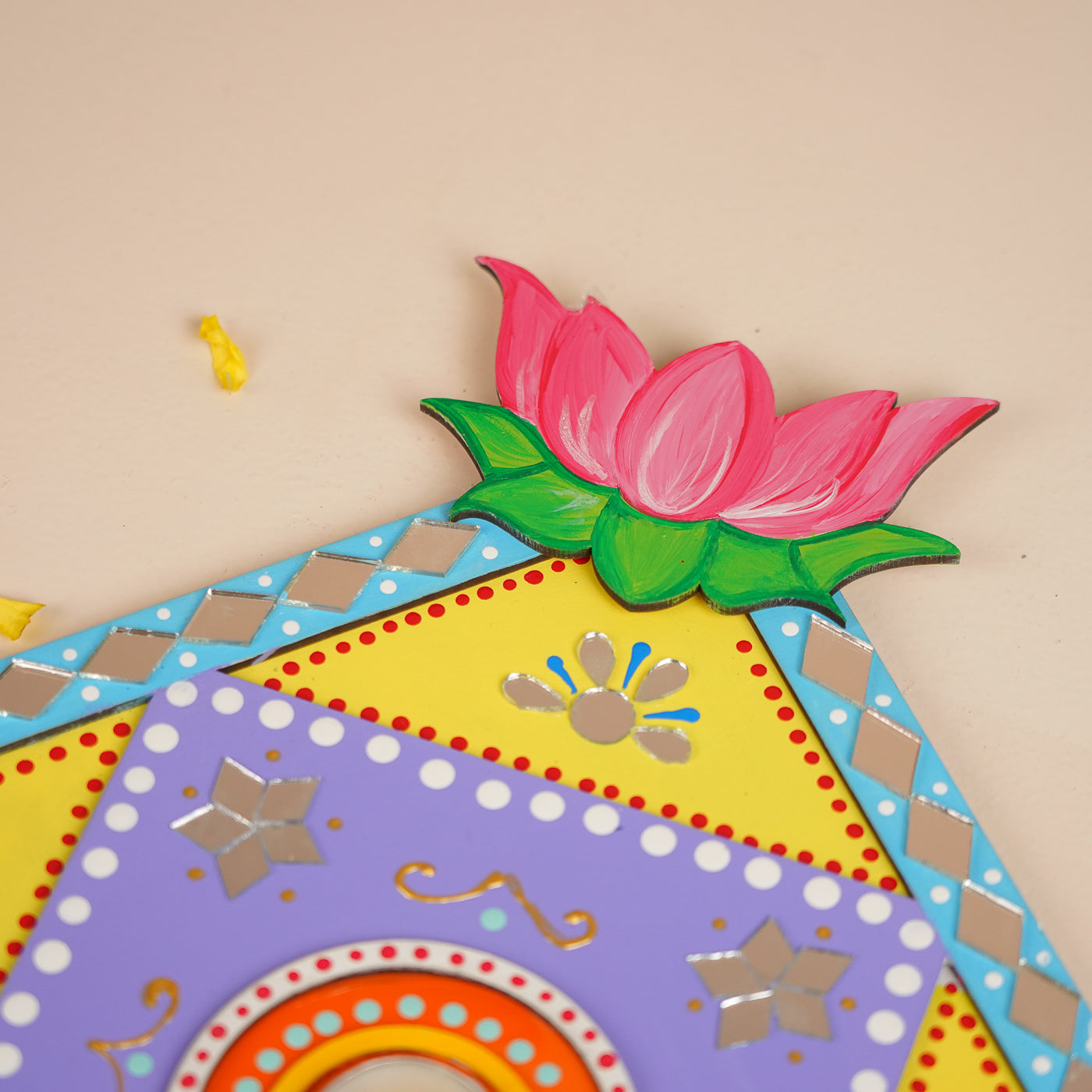 - Made from durable MDF wood, each piece is hand-painted and adorned with sparkling mirror work for a radiant look.