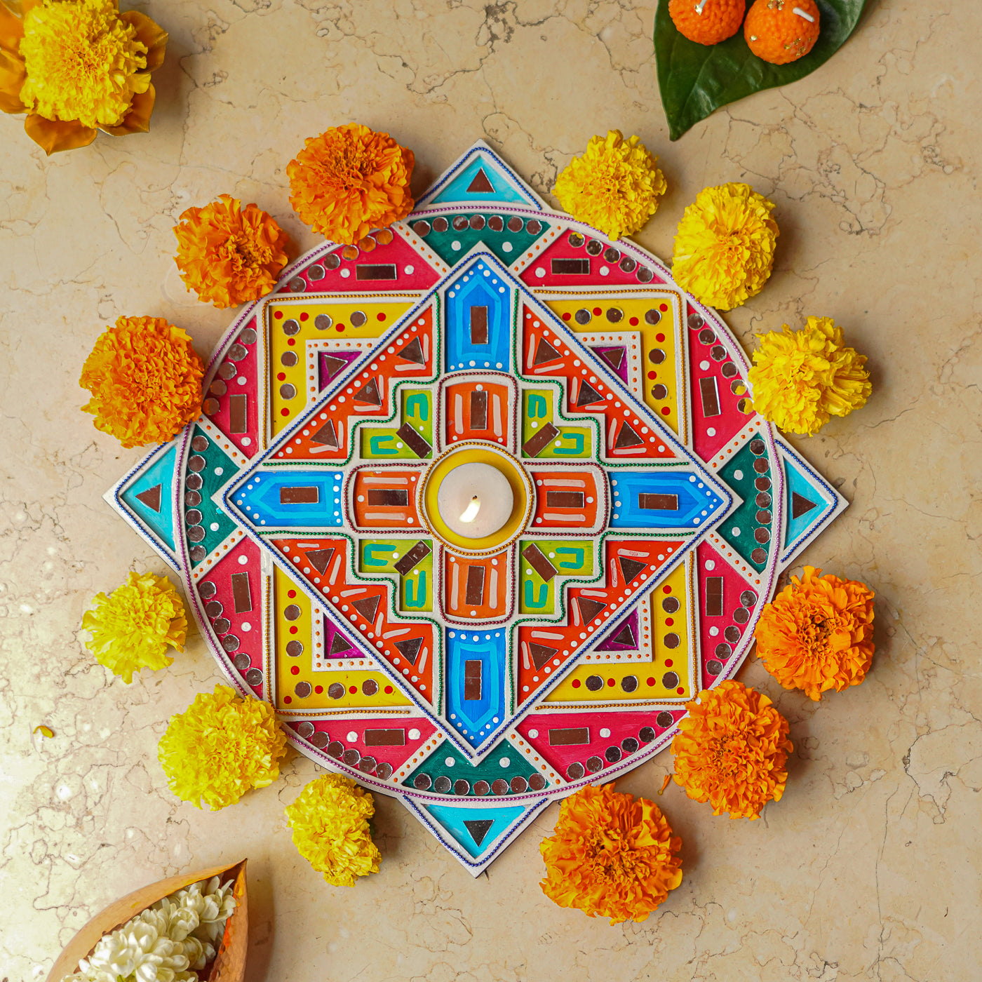- Elevate your festive décor with this handcrafted layered rangoli combining square and circle motifs.