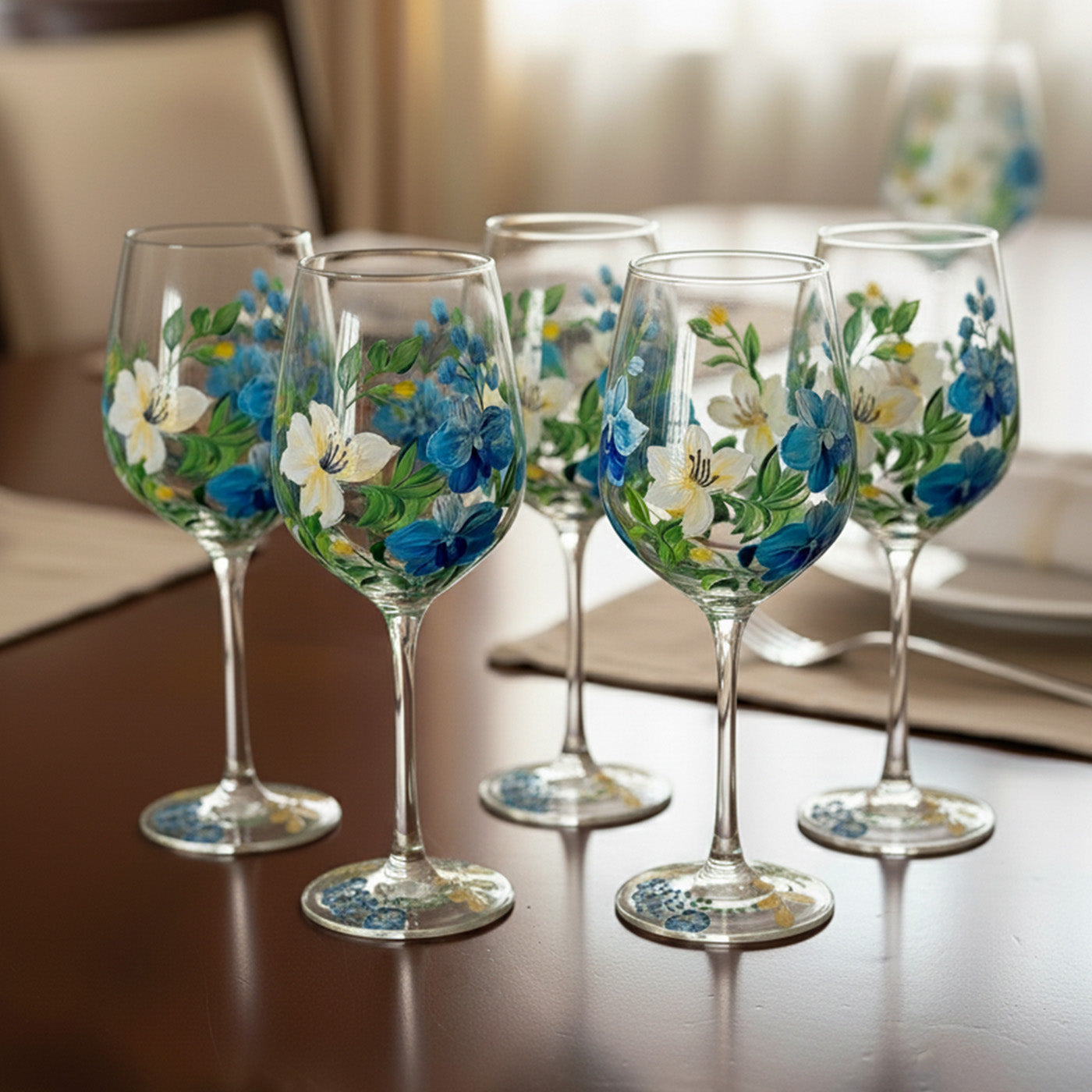 • Raise a toast to artistry with these hand-painted wine glasses blooming with orchids and lilies.