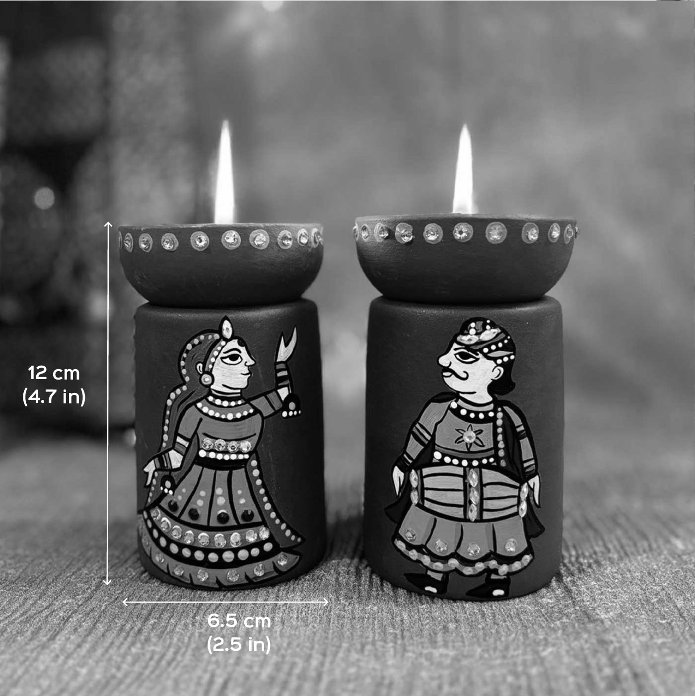- Bring home the charm of Rajasthan with this hand-painted couple-themed terracotta tealight holder set.