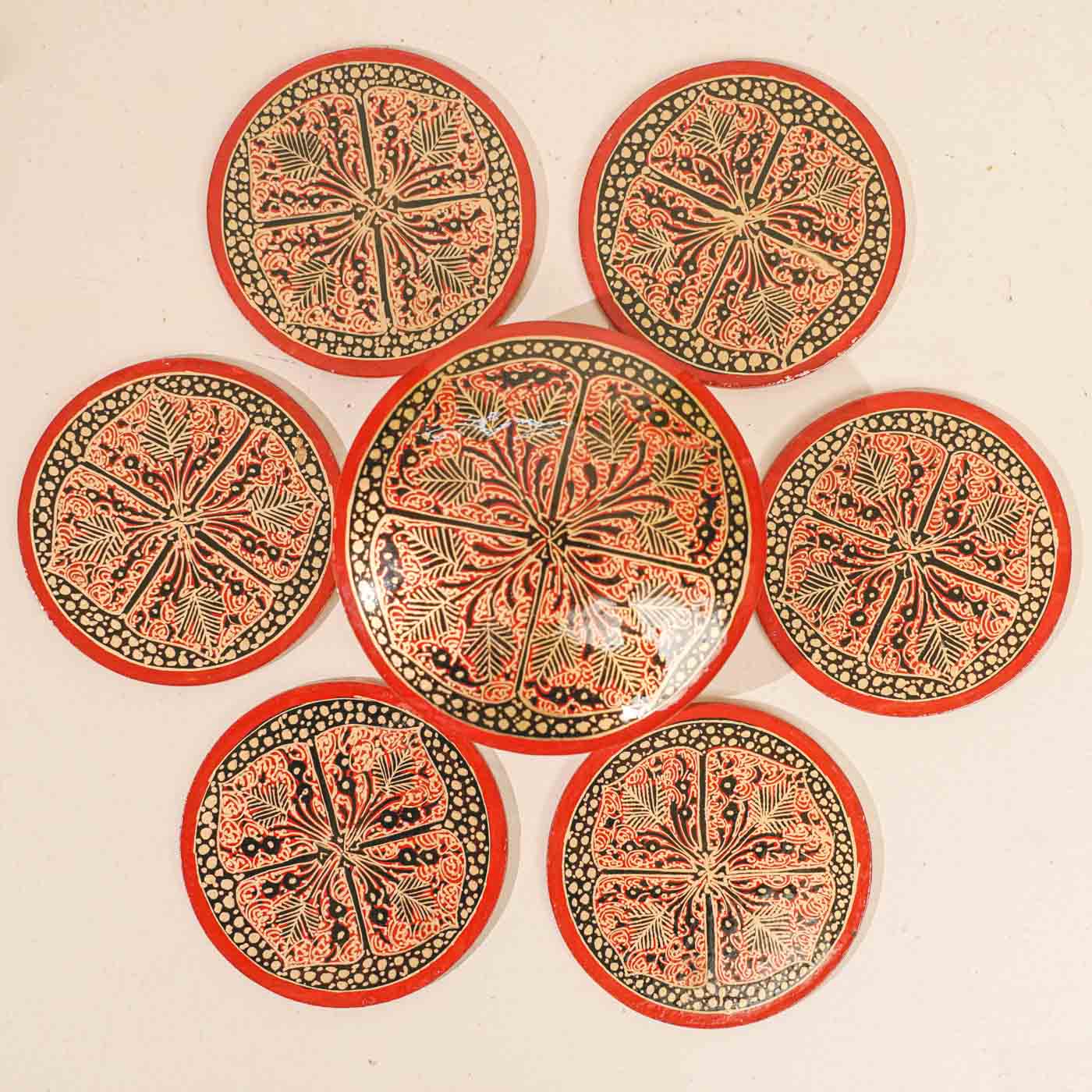 - Each coaster is crafted from paper mache and adorned with traditional naqashi designs.