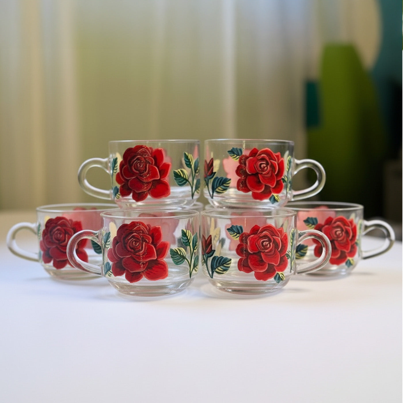 • These glass tea cups bloom with hand-painted roses in soft, vivid hues.