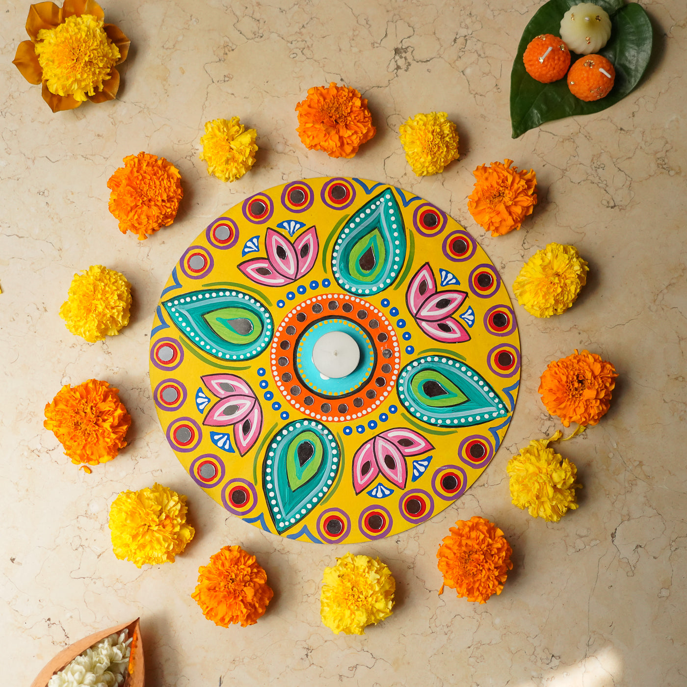 Hand-Painted Round Lotus Motif MDF Wood Rangoli