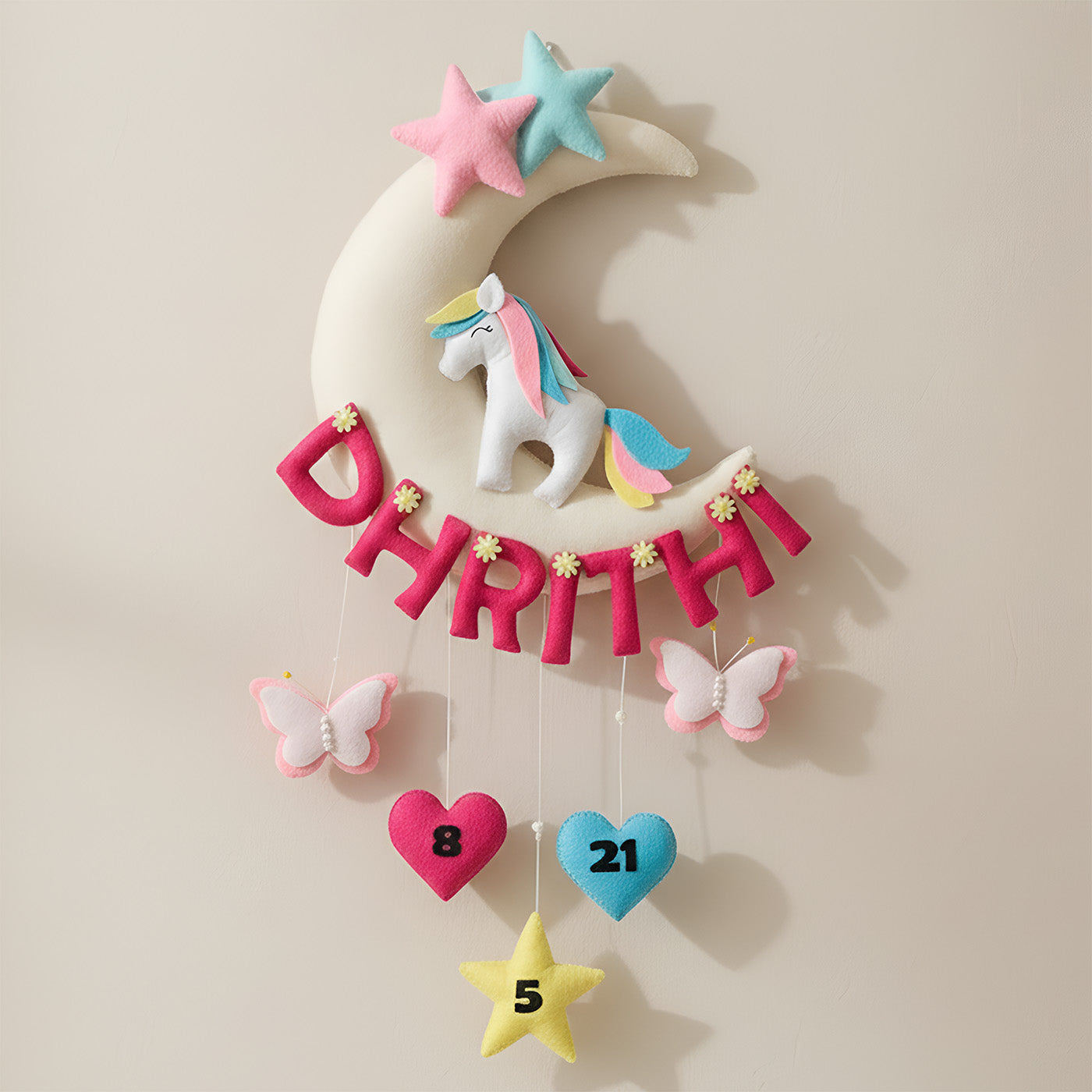 Hand-stitched Unicorn Themed Felt Moon Nameplate with Birthdate