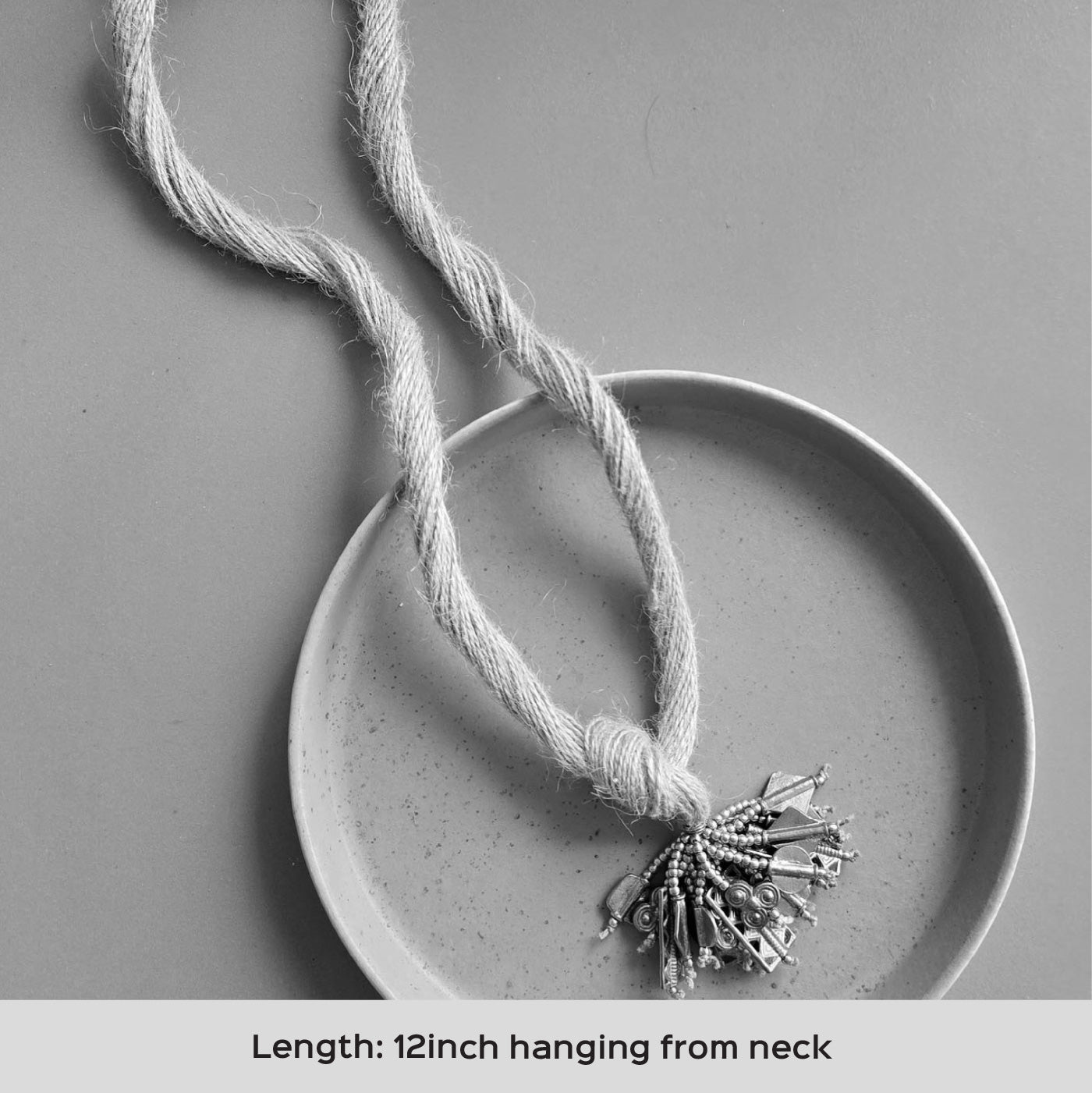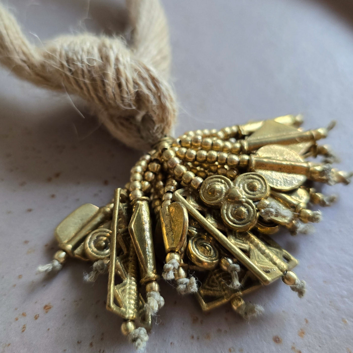 - Handcrafted from warm brass and natural jute thread, this long necklace brings earthy elegance to any outfit.