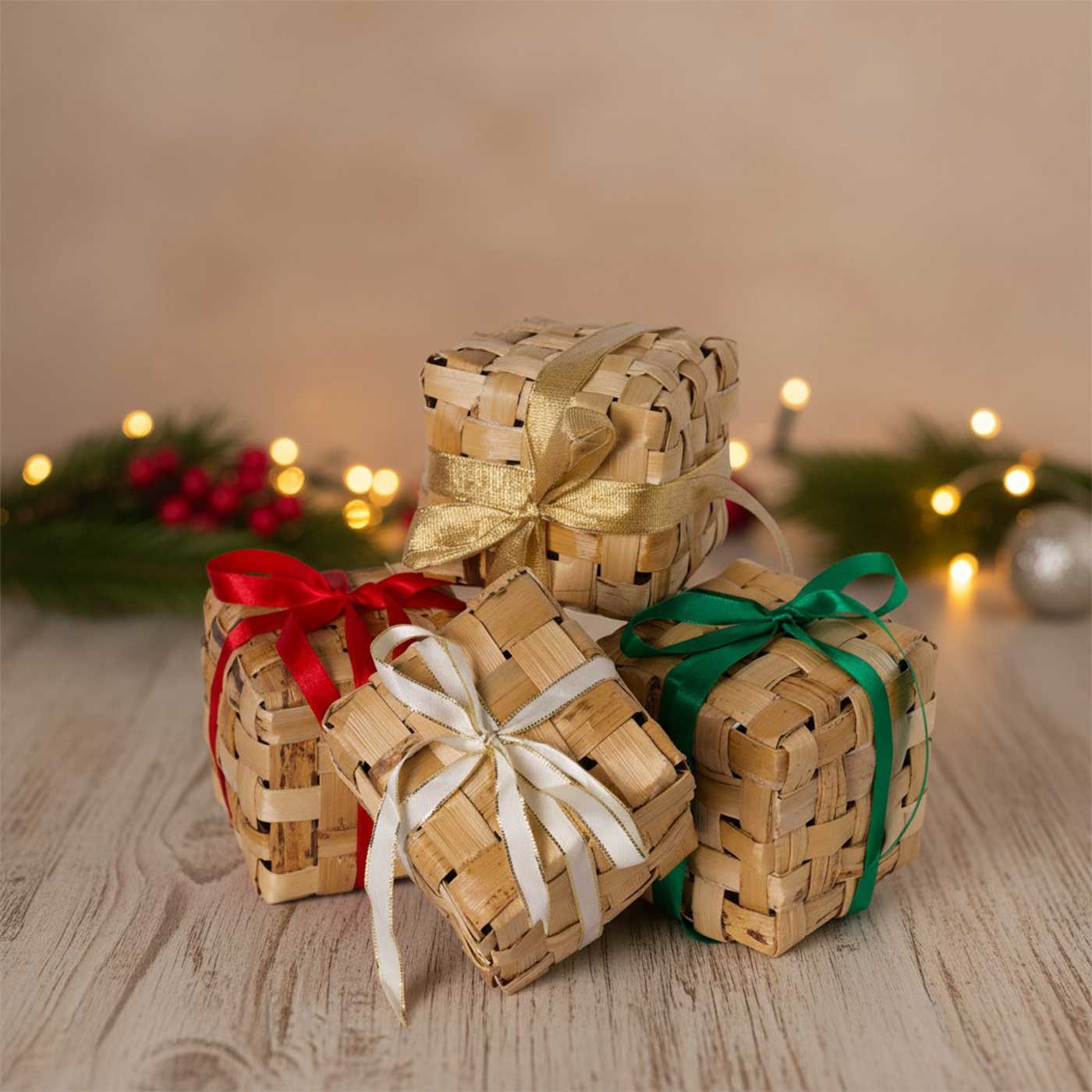 - Add festive flair with this set of handcrafted banana bark gift boxes.